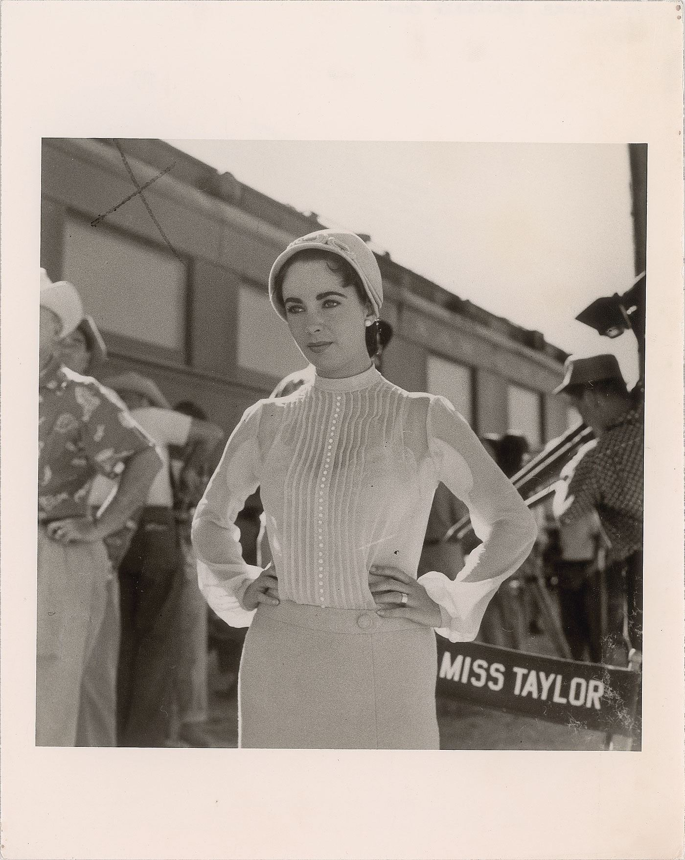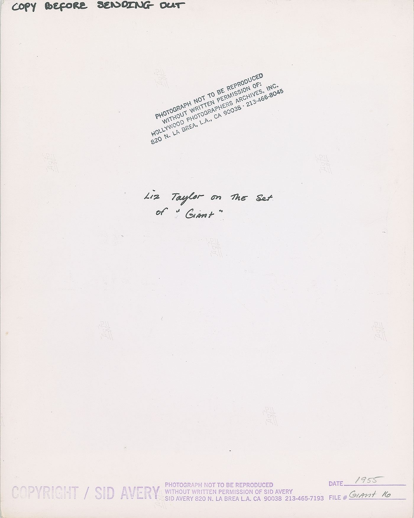 Beautiful original matte-finish 8 x 10 silver gelatin photo of Elizabeth Taylor on the set of Giant in 1955, bearing a Sid Avery copyright stamp on the reverse. In fine condition. From the Globe Photo archives.