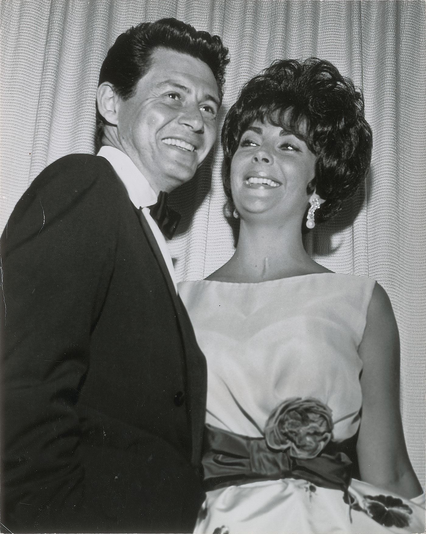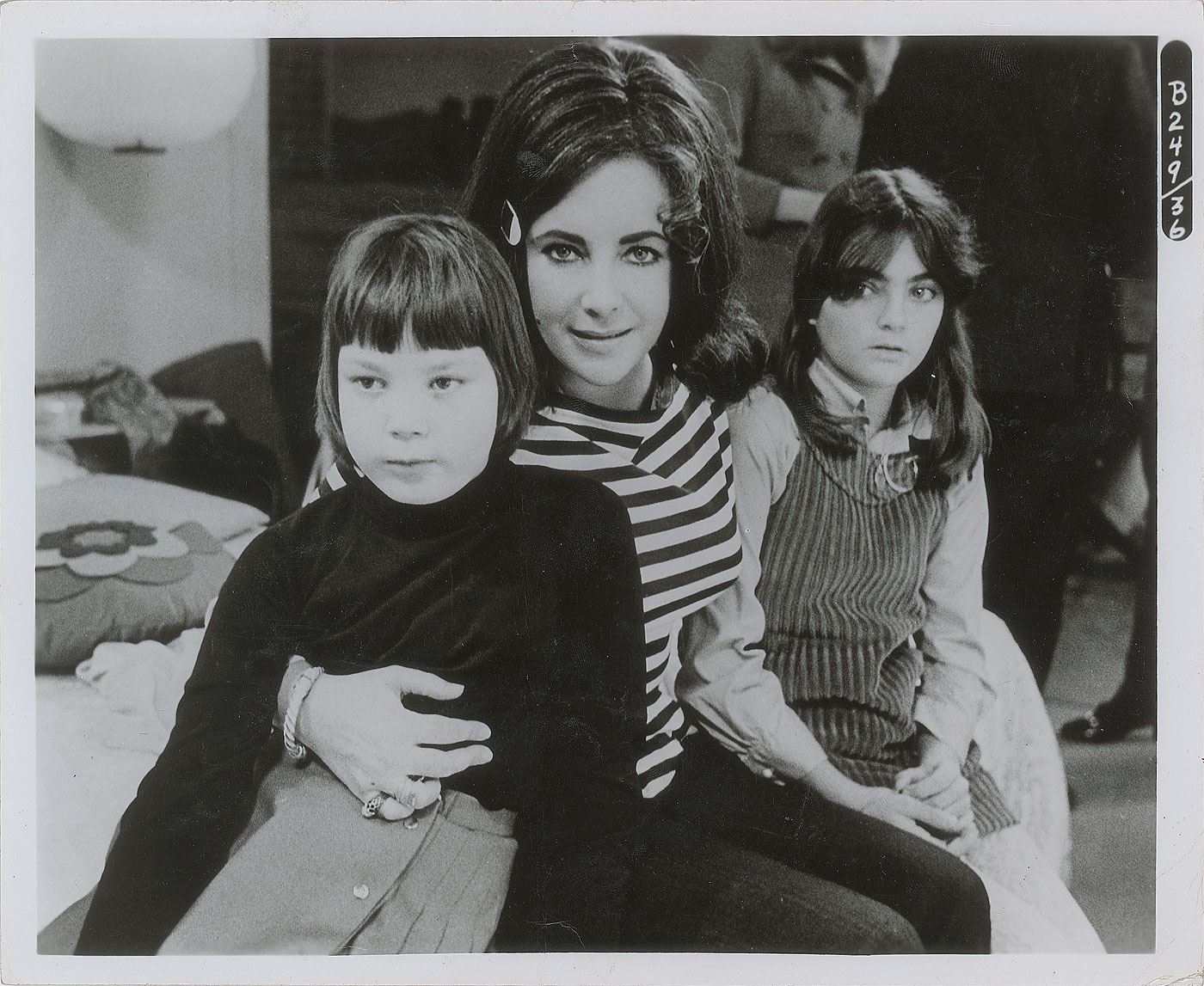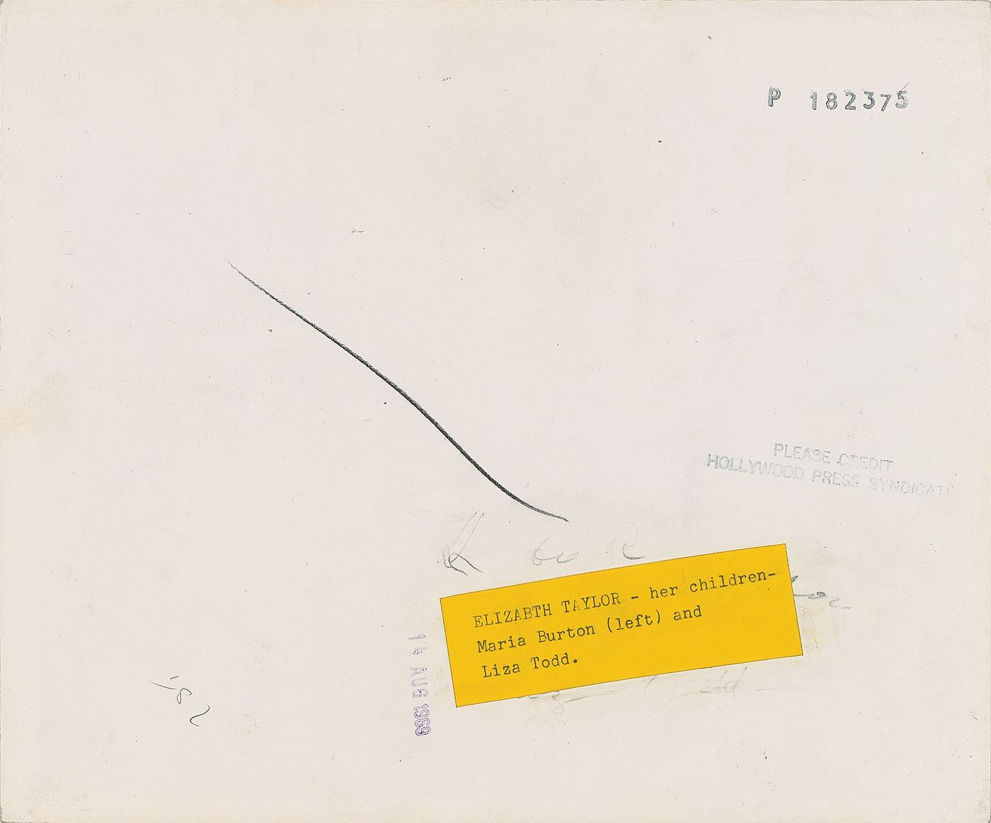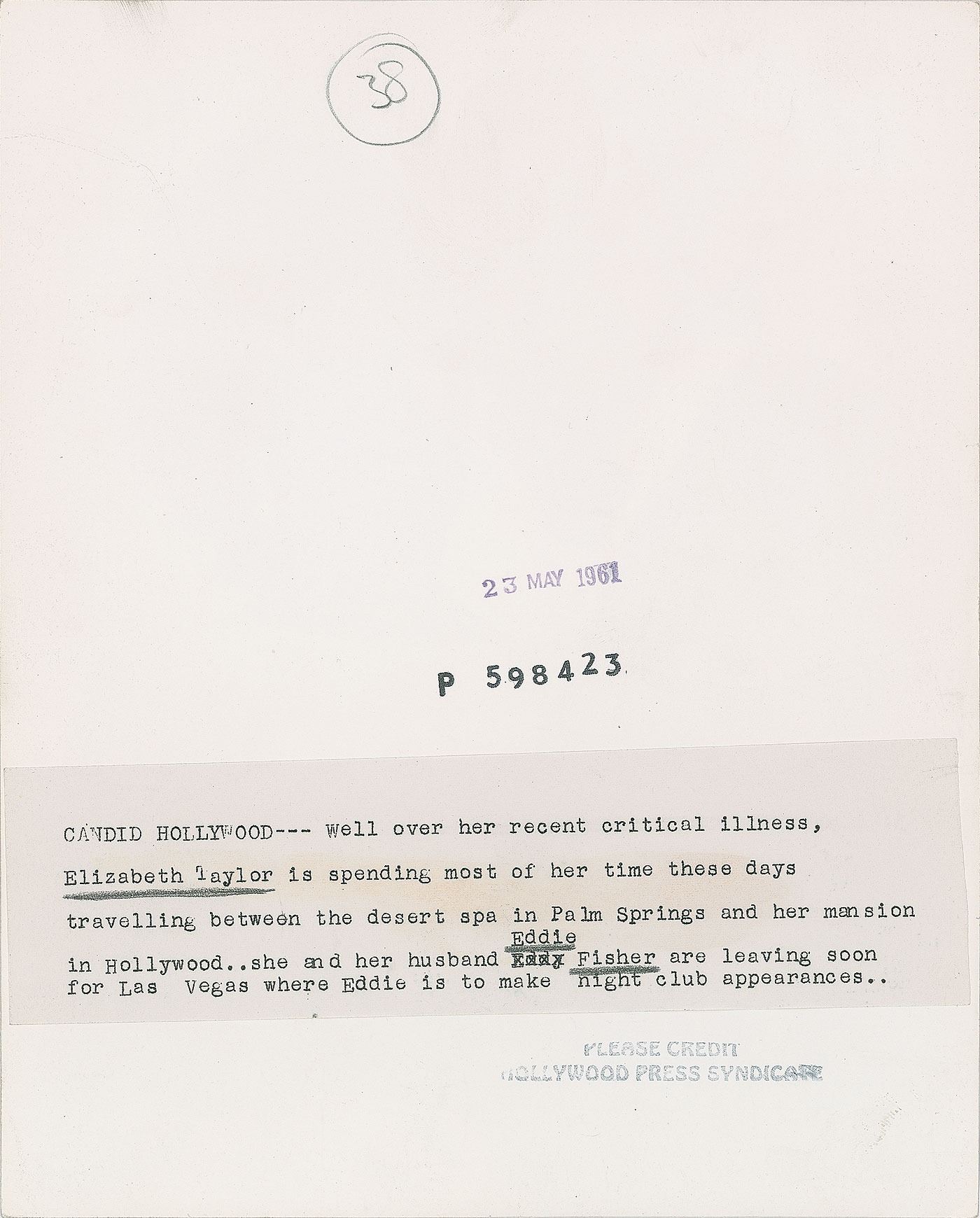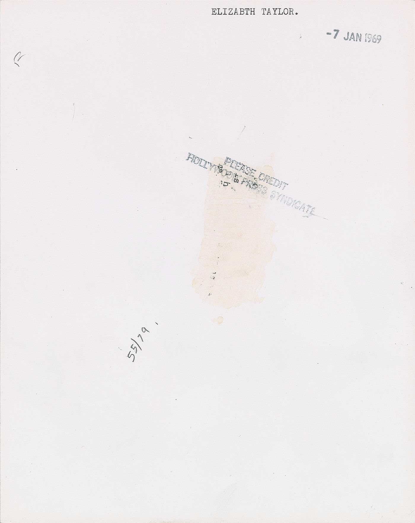 Three original vintage glossy press photos of Elizabeth Taylor, including: a 7.5 x 9.5 photo of her alone, stamp-dated January 7, 1969; a 7.5 x 9.5 photo of Taylor with her husband Eddie Fisher, stamp-dated May 23, 1961; and a 10 x 8 photo of Taylor with her children Maria and Liza, stamp-dated August 14, 1969. All bear Hollywood Press Syndicate ink stamps on the reverse. In overall fine condition, with scattered light creasing.