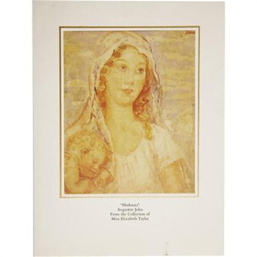 <B>Elizabeth Taylor Signed Christmas Card and Monogrammed Blanket Given as a Gift.</B></I> A Christmas card addressed to one Robert Anderson, with a secretarial Elizabeth Taylor signature, and featuring on the cover an image of <I>Madonna</B></I> by Augustus John -- a piece from Taylor's personal collection of art. The blanket is also dedicated to Anderson, with an embroidered inscription reading "Many thanks and love Elizabeth 'Poker Alice' " (in reference to her 1988 made-for-television Western). Both items are in excellent condition, with the envelope hand-addressed by Taylor. An 8" x 10" b&w photo of Taylor is also included, taken on the set of <I>Poker Alice,</B></I> while she was being interviewed by Barbara Walters. In Excellent condition with mild corner wear.<BR><BR><b>Shipping:</b> Clothing, Costumes & Jerseys (<a target="_blank" href="http://www.heritageauctions.com/common/shipping.php">view shipping information</a>)