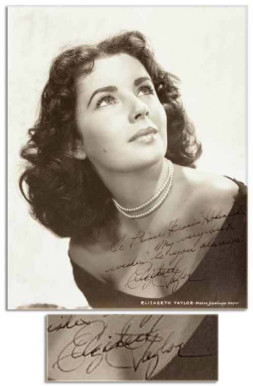 Gorgeous MGM Studios 8'' x 10'' black and white photo of Elizabeth Taylor posing in pearls. Inscribed: ''To Prince Francis Hollenback / my very best wishes to you always / Elizabeth Taylor''. Near fine condition.