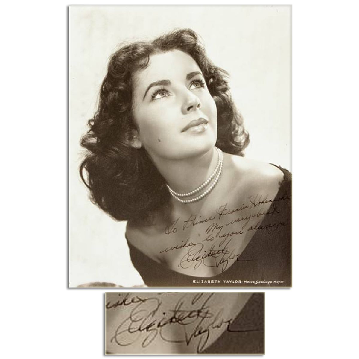 Gorgeous MGM Studios 8'' x 10'' black and white photo of Elizabeth Taylor posing in pearls. Inscribed: ''To Prince Francis Hollenback / my very best wishes to you always / Elizabeth Taylor''. Near fine condition.