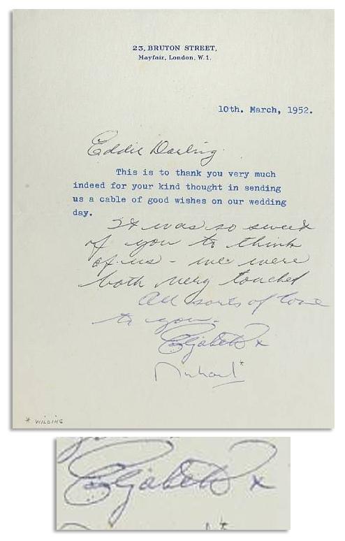 Elizabeth Taylor typed letter signed on ''23, Bruton Street, Mayfair, London'' stationery, dated 10 March 1952. Here, Taylor writes to MGM executive Eddie Mannix, with ''Eddie Darling'' in her hand and the following typed: ''This is to thank you very much indeed for your kind thought in sending us a cable of good wishes on our wedding day.'' Also in Taylor's hand: ''It was so sweet of you to think of us -- we were both very touched. All sorts of love to you. Elizabeth x''. Also signed by Michael Wilding. Letter, on one page, is near fine.