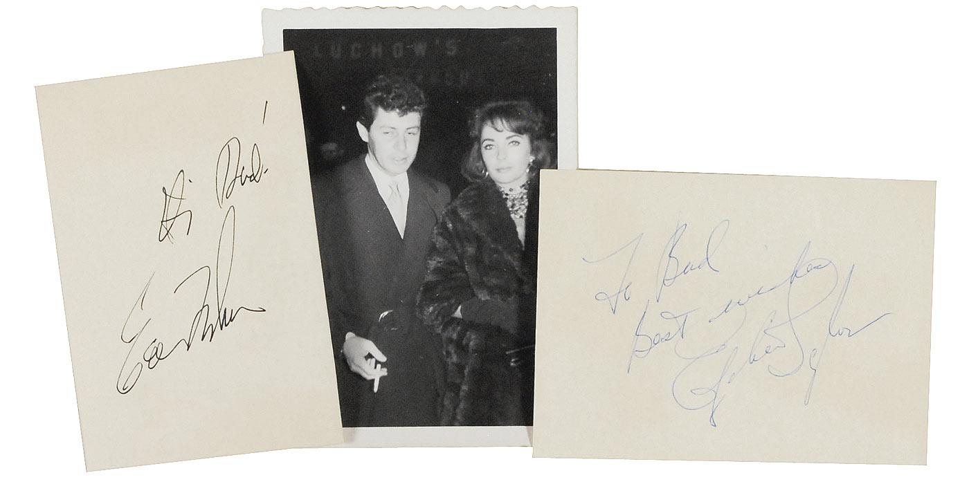 Vintage ballpoint signature and inscription, “To Bud, Best wishes, Elizabeth Taylor,” on an off-white 4.5 x 3.25 card; and an ink signature and inscription, “Hi Bud! Eddie Fisher,” on an off-white 3 x 4.5 card. In fine condition, with a bit of mild toning showing through from reverse of both cards. Accompanied by an unsigned June 1960 candid snapshot of Taylor and Fisher.