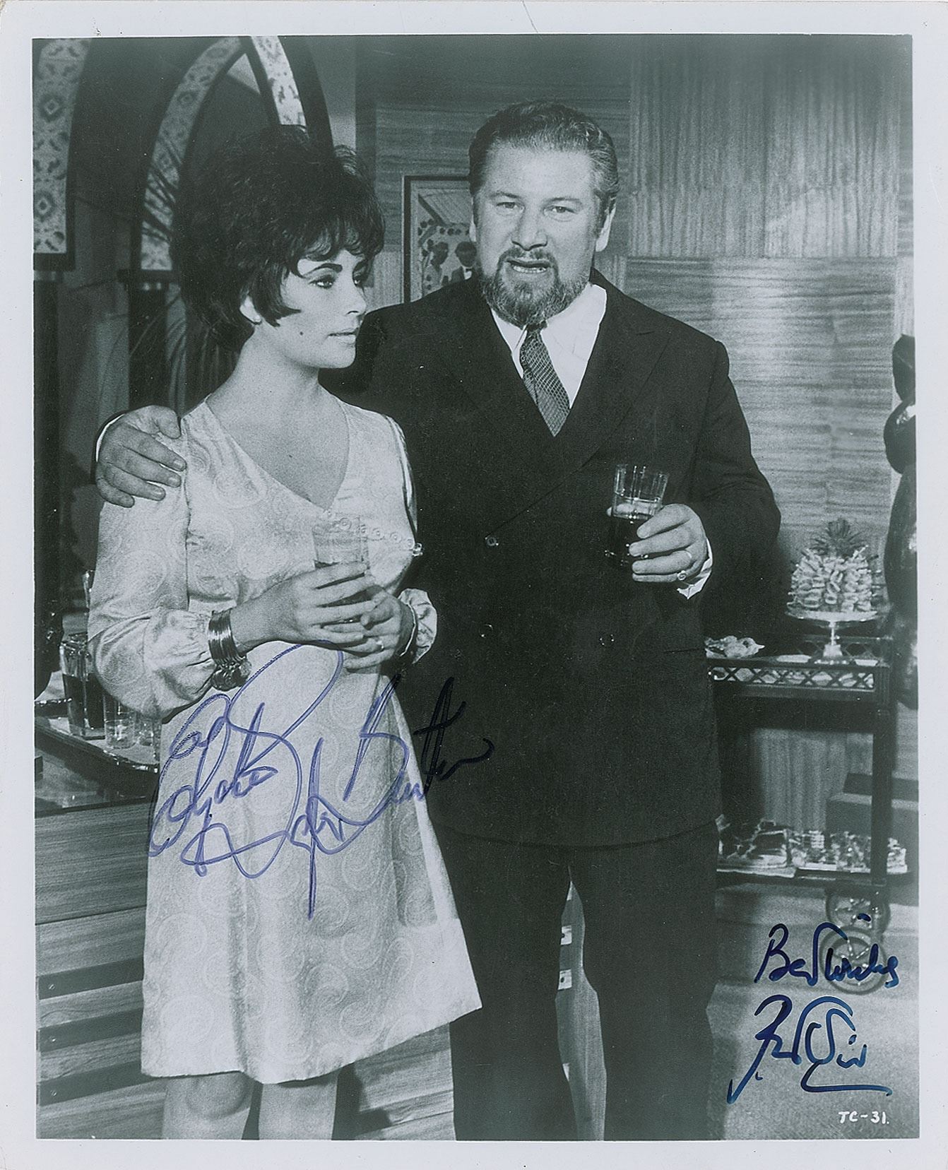 Glossy 8 x 10 photo of Elizabeth Taylor as Martha Pineda and Peter Ustinov as Ambassador Pineda in the 1967 political drama The Comedians, signed by both in black felt tip. In very good to fine condition, with scattered light creasing.