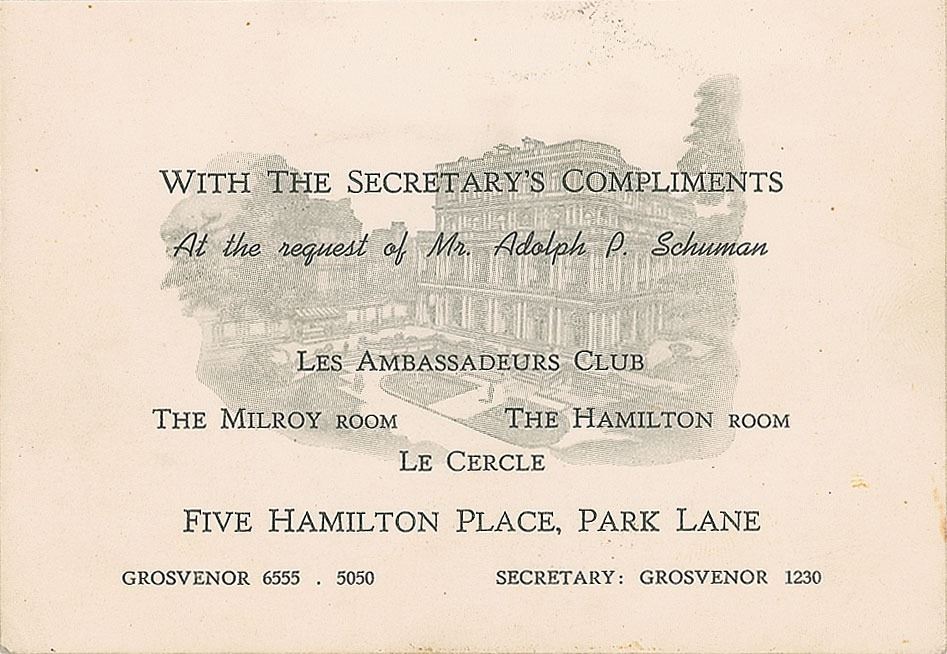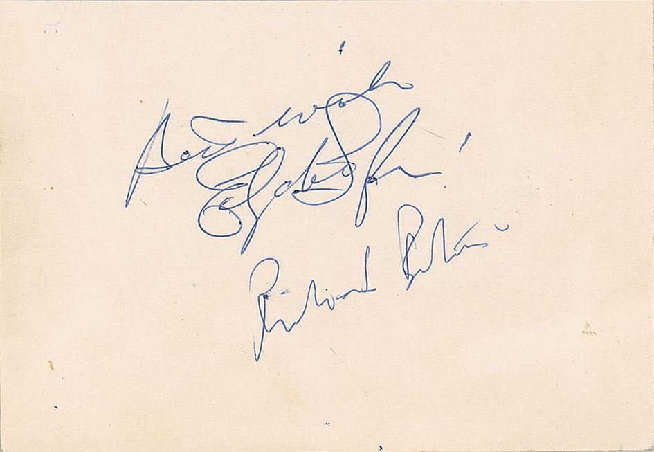 Ballpoint signatures, "Best wishes, Elizabeth Taylor" and "Richard Burton," on the reverse of a compliment's card from London's Les Ambassadeurs Club. In fine condition, with very mild soiling.