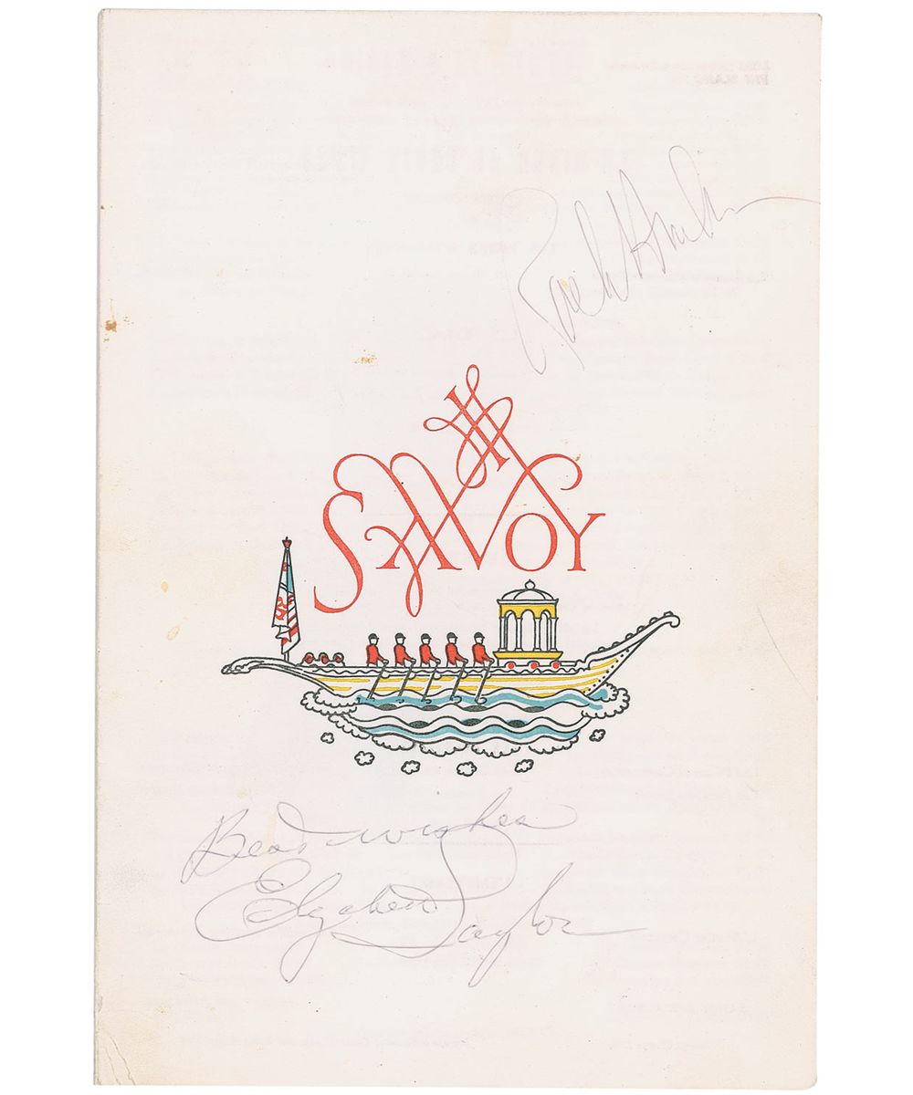 Menu from the Savoy, two pages, in French, signed on the front in ballpoint, “Best wishes Elizabeth Taylor,” and “Rock Hudson.” In fine condition, with a couple light corner creases and some scattered trivial soiling.