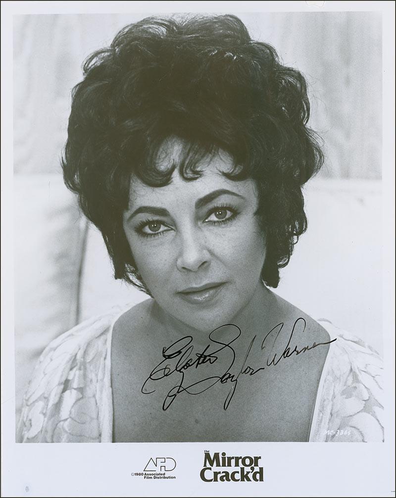 Glossy 8 x 10 AFD promotional photo for The Mirror Crack’d, signed in black felt tip, “Elizabeth Taylor Warner.” In fine condition, with small chip to top edge and promotional information affixed to the reverse.