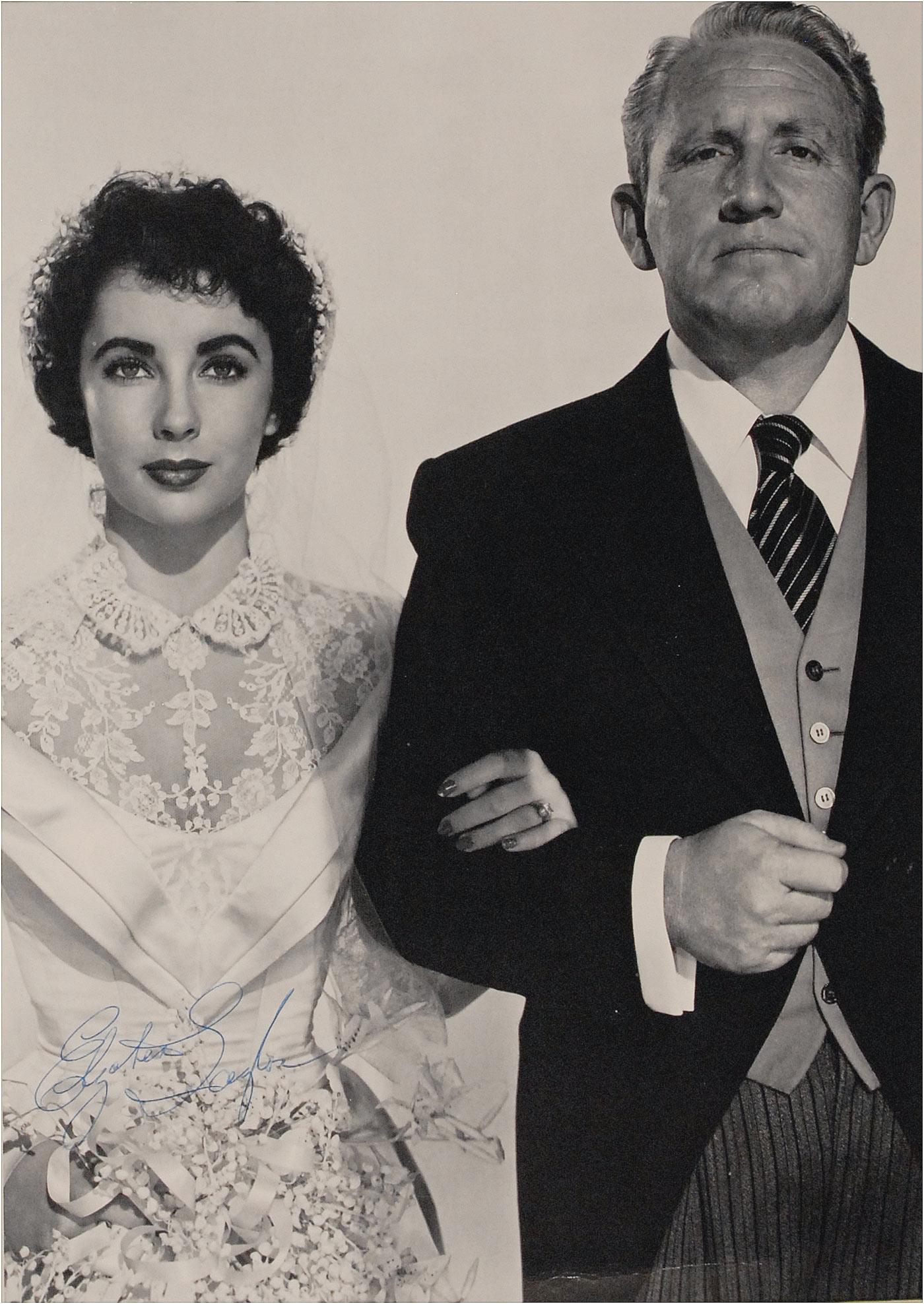 Impressive oversized cardstock 11 x 17 photo of Taylor arm-in-arm with Spencer Tracy in Father of the Bride, signed in blue ballpoint by Taylor. Photo is triple matted to a visible image size of 9.75 x 14 to an overall size of 16 x 20. In very good condition, with missing top left corner, although not visible due to the matting, lightly trimmed edges, and a horizontal crease along bottom of image.