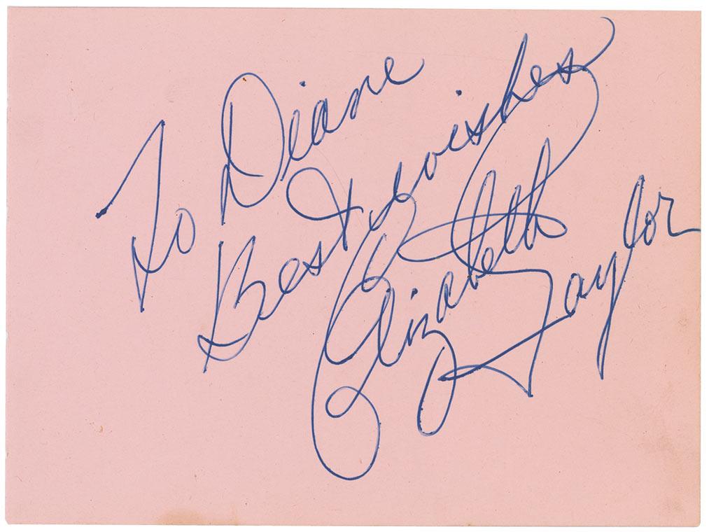 Ballpoint signature and inscription, “To Diane, Best wishes, Elizabeth Taylor,” on a pink 5.5 x 4.25 album page. In fine condition, with a few spots of soiling and staining along the edges and slight wrinkling from a smaller album page affixed to the reverse.