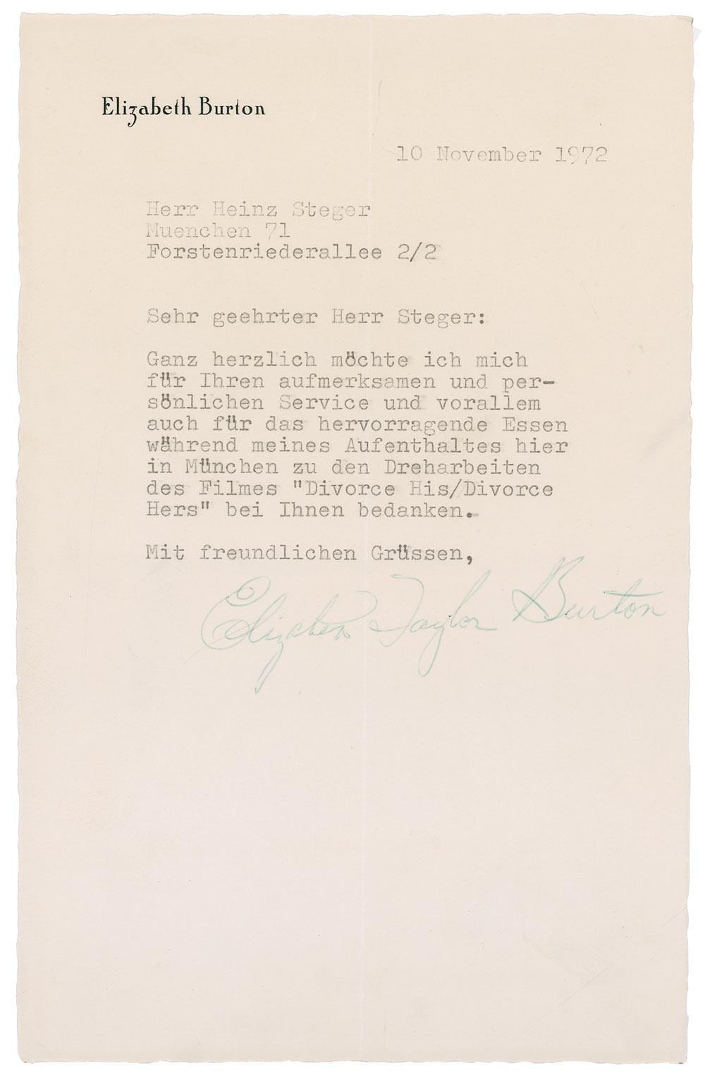 TLS in German, signed “Elizabeth Taylor Burton,” one page, 5.25 x 8, personal letterhead, November 10, 1972. A letter of thanks to one of her personal kitchen employees. In part (translated): “I would like very much [to thank ] for its attentive and personal service and most importantly for the excellent food during my stay in Munchen the filming here of the movie ‘Divorce His/Divorce Hers.” In fine condition, with a central vertical fold.