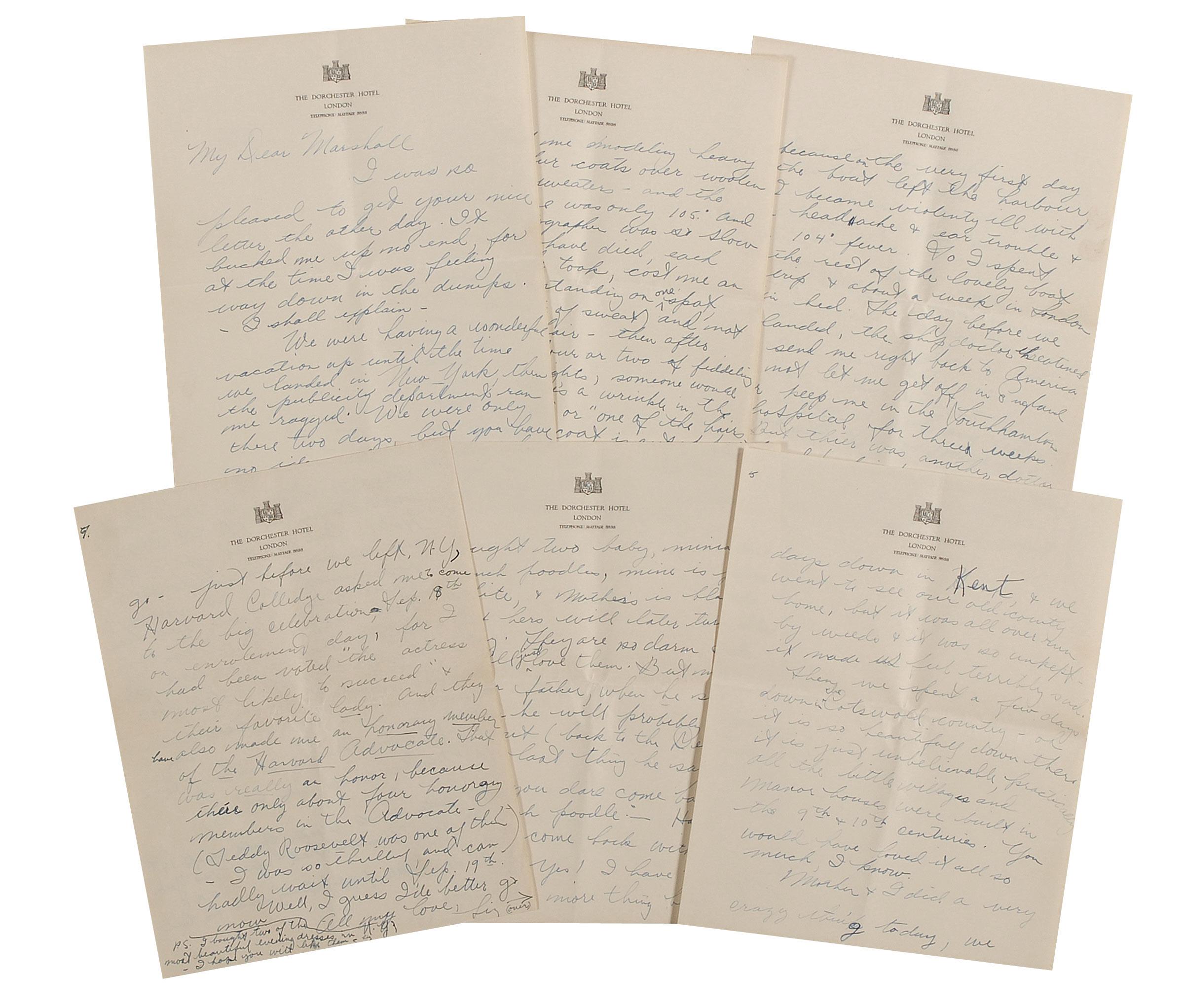 Phenomenal eight page ALS on 6.5 x 8 off-white Dorchester Hotel London stationary, circa 1947. Correspondence with her friend and fellow actor, Marshall Thompson. In part: “I was so pleased to get your nice letter the other day. It bucked me up no end, for at the time I was feeling way down in the dumps. – I shall explain – We were having a wonderful vacation up until the time we landed in New York, then the publicity department ran me ragged. We were only there two days, but you have no idea what torture they can put you through in just two days. One day they had me modeling heavy winter fur coats over woolen shirts & sweaters – and the temperature was only 105. And the photographer was so slow I could have died, each picture he took, cost me an hour of standing on one spot, (in a puddle of sweat) and not moving a hair…I think it was that day that did something to my nerves of resistance or something because on the very first day the boat left the harbor, I became violently ill with a headache & ear ache & a 104 fever. So I spent the rest of the lovely boat trip & about a week in London in bed…so when your letter arrived I was very angrily thinking of how many years I had looked forward to coming back to England, and now that I was here, I had just traveled thousands of miles to land in a bed. But your letter made me feel loads better, and now I couldn’t feel any better at all…We spent several days down in Kent, & we went to see our old county home, but it was all over run by weeds & it was so unkept – it made us feel terribly sad…Mother & I did a very crazy thing today, we bought two baby, miniature French poodles…They are so darn cute, you’ll just love them. But my poor father, when he sees them he will probably throw us out (back to the Del Mar again) – The last thing he said was – ‘Don’t you dare come back with a French poodle.’ – Ha Ha – so we come back with two. Oh Yes! I have to tell you one more thing before I go – just before we left NY, Harvard College asked me to come to the big celebration, Sept. 19th on enrollment day, for I had been voted ‘the actress most likely to succeed’ & their favorite lady. And they have also made me an honorary member of the Harvard Advocate. That was really an honor, because there are only about four honorary members in the Advocate – (Teddy Roosevelt was one of them) – I was so thrilled, and can hardly wait until Sep. 19th…P.S. Please write me in New York, we’re staying at the St. Regis Hotel. I’ve missed you a lot, and so many times I thought how much fun it would have been, if you had been here with us too. I can hardly wait to see you…So, ‘Hasta la vista’…P.S...My little puppy ‘Teeny’ sends his love too.” In fine condition, with scattered creasing and uniform toning.