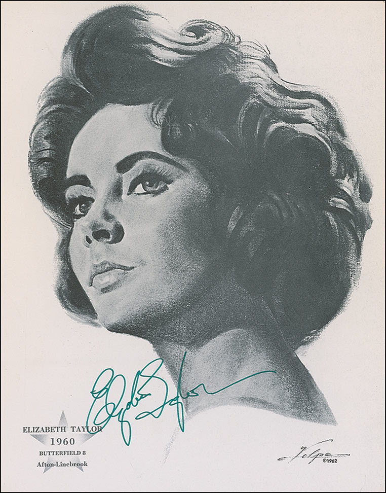 Sultry Volpe print, 8.25 x 10.5, picturing Elizabeth Taylor from her 1960 film Butterfield 8, signed in green felt tip “Elizabeth Taylor.” In fine condition, with some surface bends and creasing.