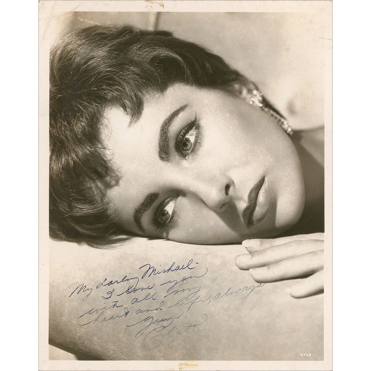 Mesmerizing vintage matte-finish 8 x 10 close-up photo of Taylor lying on a pillow, signed and inscribed in fountain pen, “My darling Michael, I love you with all my heart and life, always, Your, Elizabeth.” In very good condition, with a few light creases to the left corners, mild rippling and slight discoloration from water exposure affecting the facial area, silvering to some of the darker areas, small areas of adhesive remnants to the top and bottom border, and the signature a shade light due to decreased ink flow. According to the consigner, this photo was inscribed to her second husband, Michael Wilding. Taylor was Wilding’s second wife as well, he being married four times to her seven. A beautiful inscription from one lover to another.