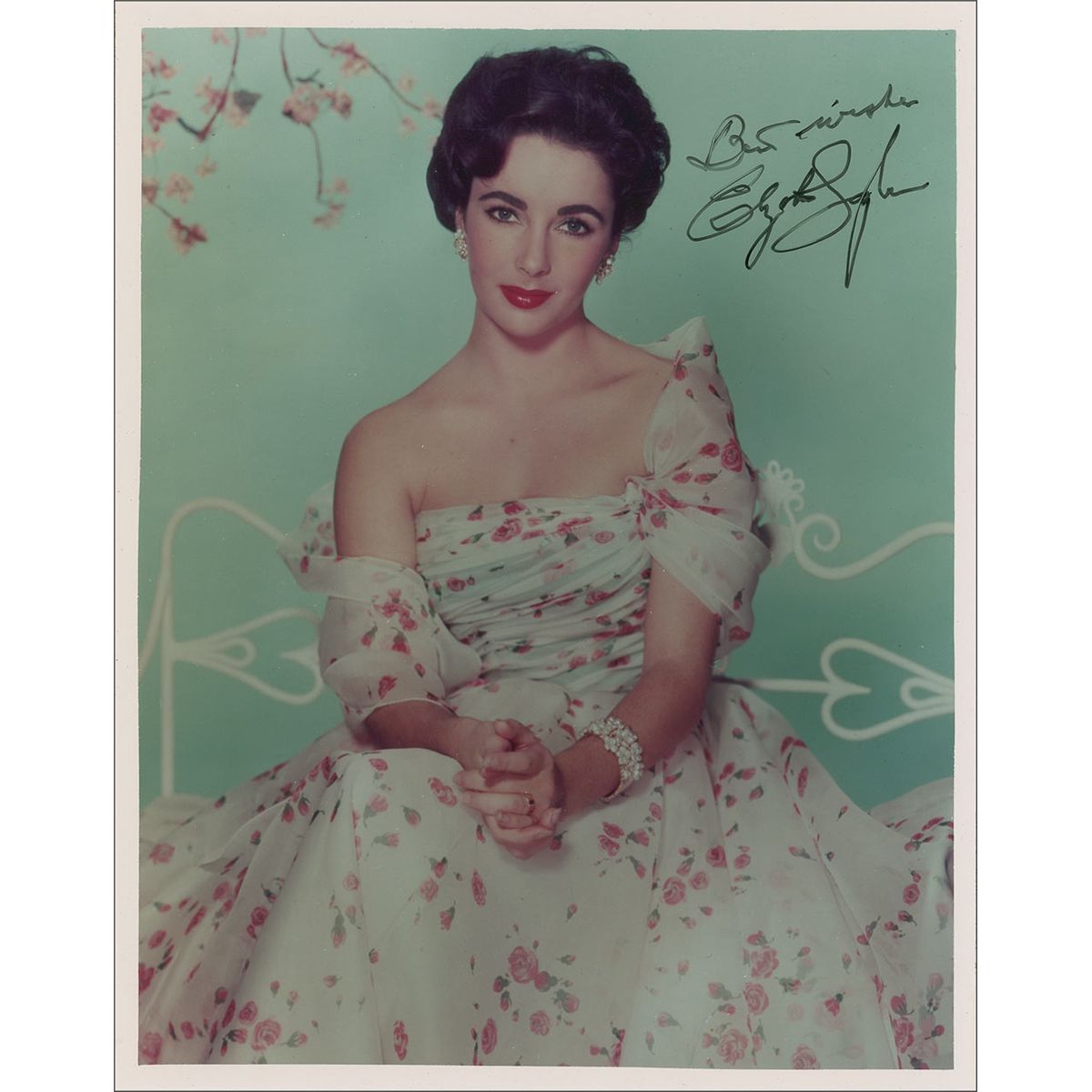 Gorgeous color glossy 8 x 10 photo of Taylor in a floral print dress, signed in black felt tip, “Best wishes, Elizabeth Taylor.” In fine condition. Accompanied by a full letter of authenticity from PSA/DNA.