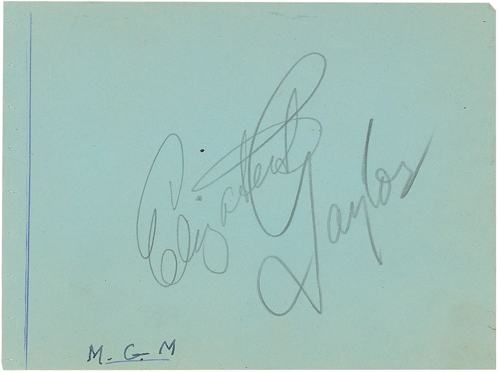 Vintage pencil signature, “Elizabeth Taylor,” on a light green 5.75 x 4.25 album page with collector’s notation to bottom edge. In fine condition, with a few slight creases, and binding holes and ink line to left edge, which could be easily matted out.