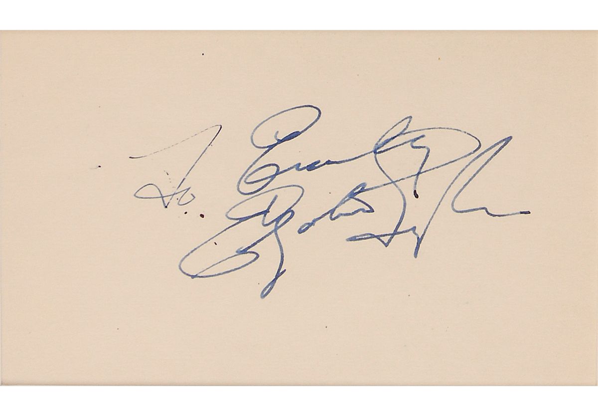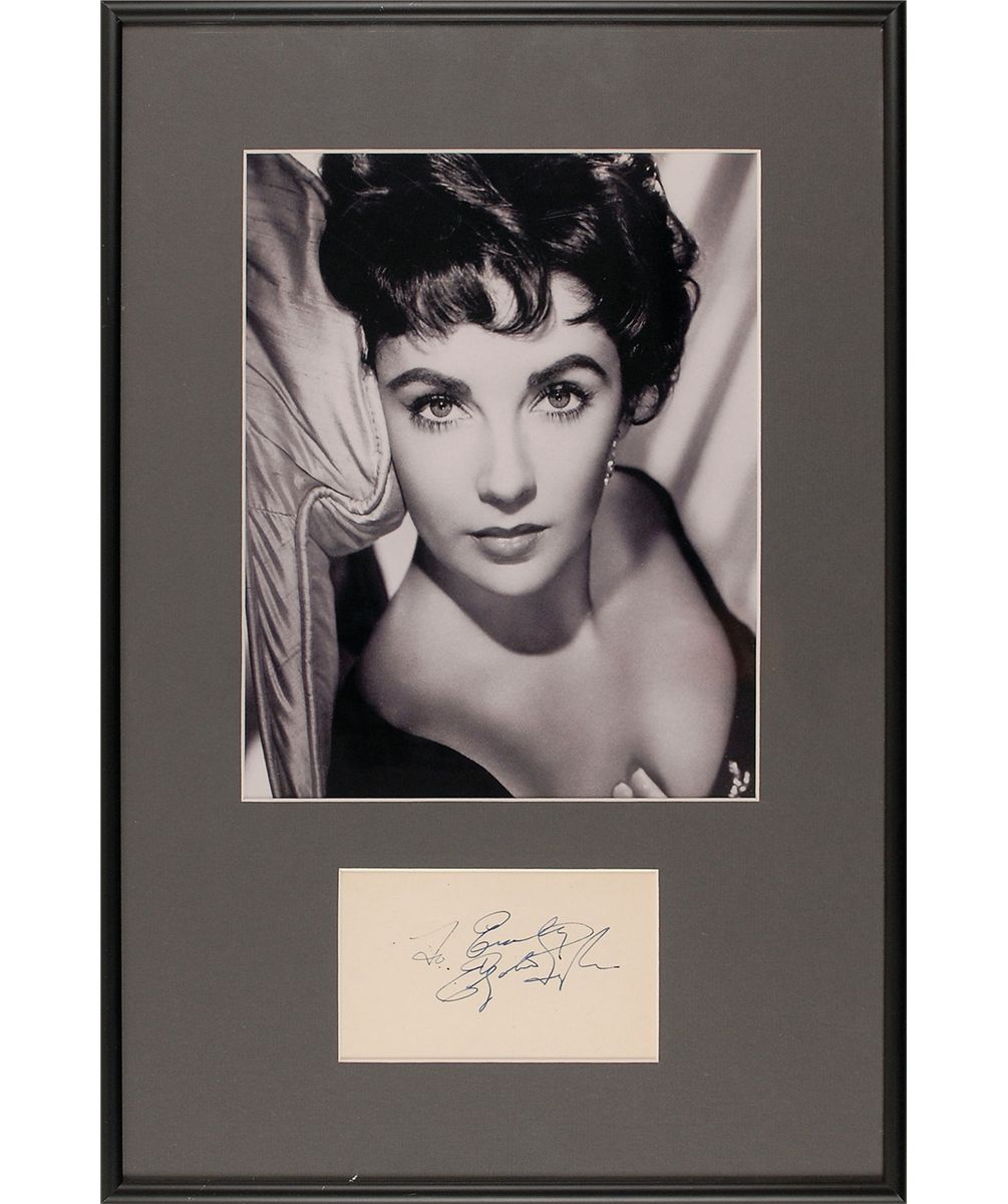 Vintage ink signature and inscription, “To Emily, Elizabeth Taylor,” on an off-white card. Matted and framed with a gorgeous portrait to an overall size of 12.25 x 18.25. In fine condition, with a few stray ink flecks.