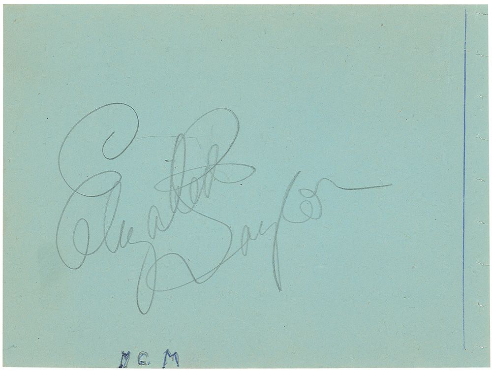 Vintage pencil signature, “Elizabeth Taylor,” on a light green 5.75 x 4.25 album page with collector’s notation to bottom edge. In fine condition, with a few mild creases, slight toning to left border, and ink line to right border which could be easily matted out.