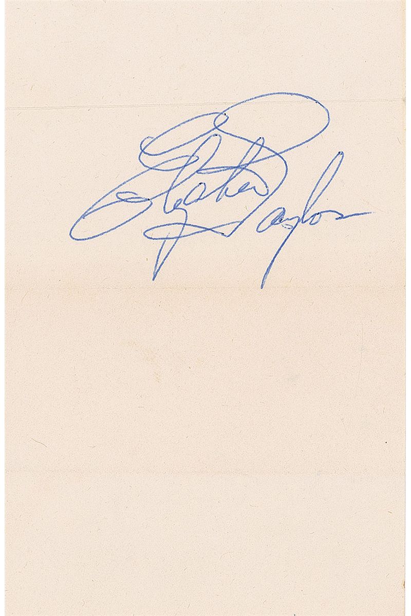 Ballpoint signature, “Elizabeth Taylor,” on an off-white 3 x 4.5 sheet. In fine condition, with horizontal fold touching the tops of a couple letters of signature. Accompanied by an unsigned glamorous color satin-finish 8 x 10 photo.