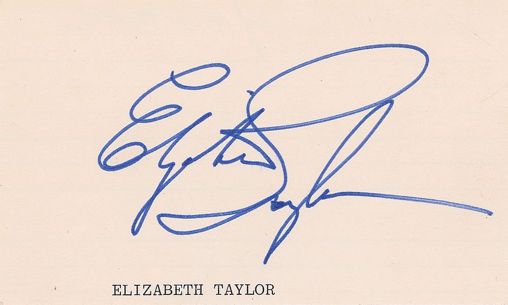 Felt tip signature, “Elizabeth Taylor,” on an off-white 5 x 3 card bearing a collector’s notation. In fine condition. Accompanied by an unsigned glossy photo.