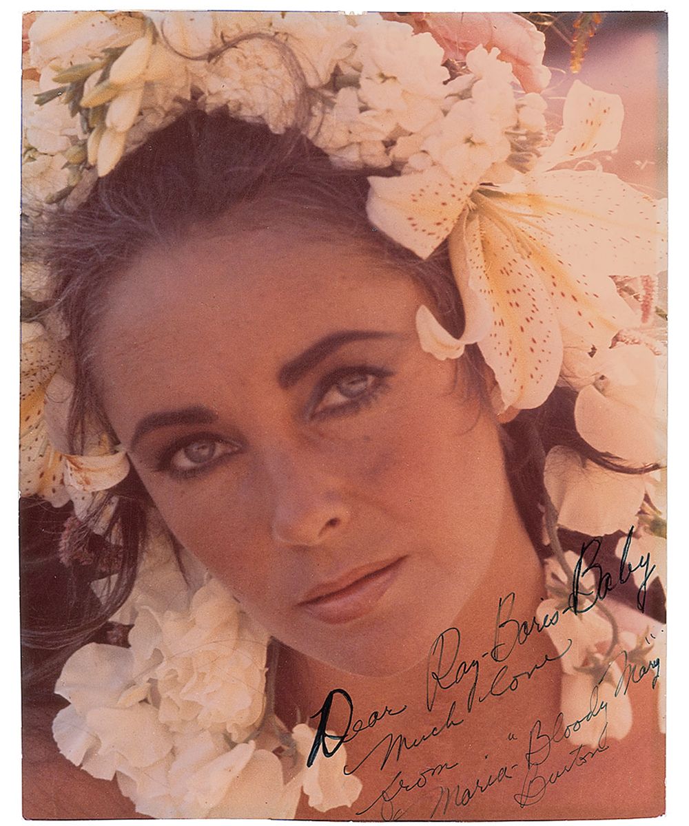 Color glossy 8 x 10 photo of Taylor adorned with flowers, signed and inscribed in black ink, “Dear Ray-Boris-Baby, Much love, from Maria ‘Bloody Mary’ Burton.” A few surface dings and impressions, and slightly trimmed edges, otherwise fine condition.