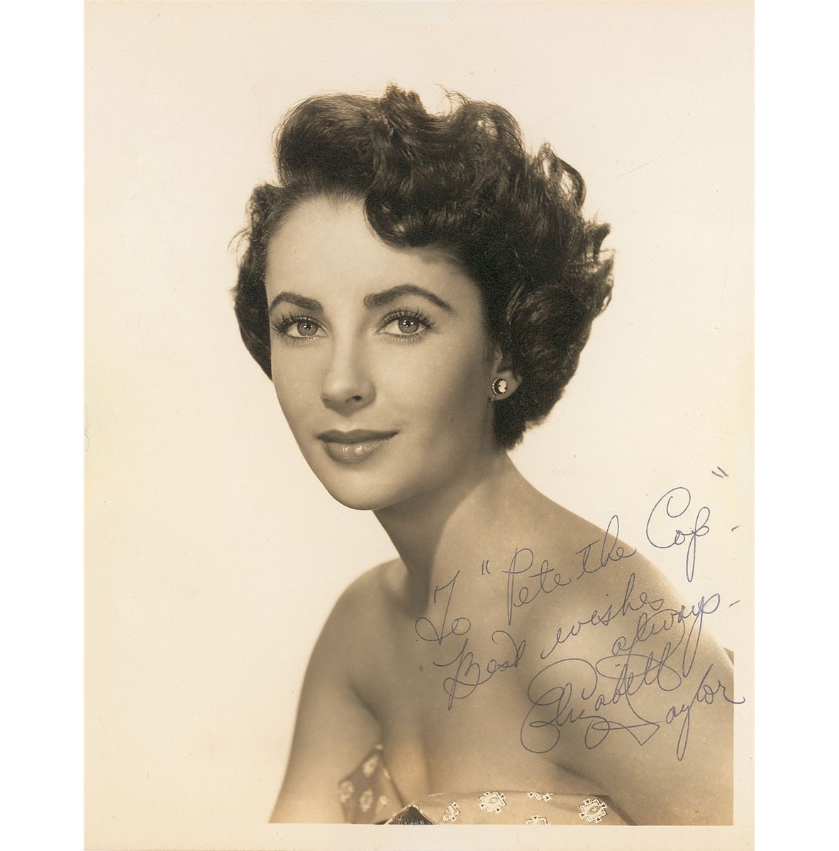 Stunning vintage circa early to mid-1950s matte-finish 8 x 10 head-and-shoulders photo of Taylor as a young woman, signed and inscribed in blue ballpoint, “To ‘Pete the Cop,’ Best wishes always, Elizabeth Taylor.” In fine condition. An outstanding example from this Hollywood legend who has become quite elusive in signed photos of this era.