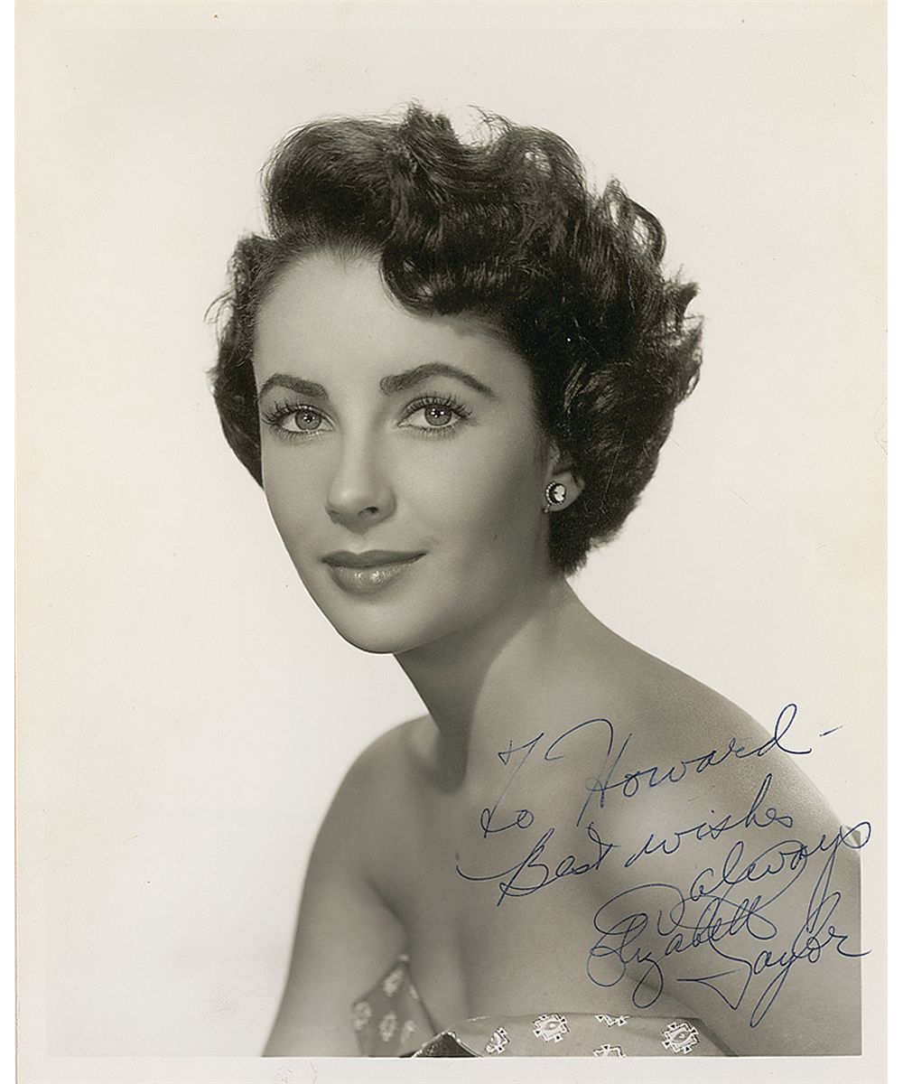 Gorgeous vintage matte-finish 8 x 10 photo of Taylor in a strapless top, circa 1950–51, signed and inscribed in blue ballpoint, “To Howard—Best wishes always, Elizabeth Taylor.” In fine condition. The image originates from around the time of one of Taylor’s earliest successes, George Stevens’s A Place in the Sun. Vintage signed photos of Taylor of this caliber are few and far between.