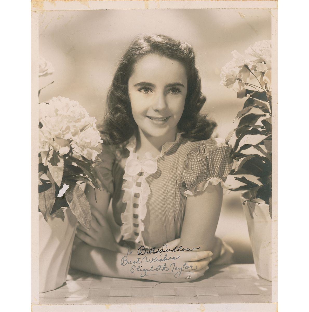Vintage matte-finish 8 x 10 photo, signed and inscribed in fountain pen to 1940s–1950s MGM entrance gate security officer Bill Ludlow, “To Bill Ludlow, Best wishes, Elizabeth Taylor.” Taylor has apparently traced over the first name in the inscription, and added his last name as well. Scattered adhesive remnants and toning, primarily to borders and background, with a small spot of toning over last name of signature, a few surface marks to background, and aforementioned addition to the inscription, otherwise fine condition. From around the time of National Velvet, this photo is one of the earliest signed Taylor photos we have ever seen.