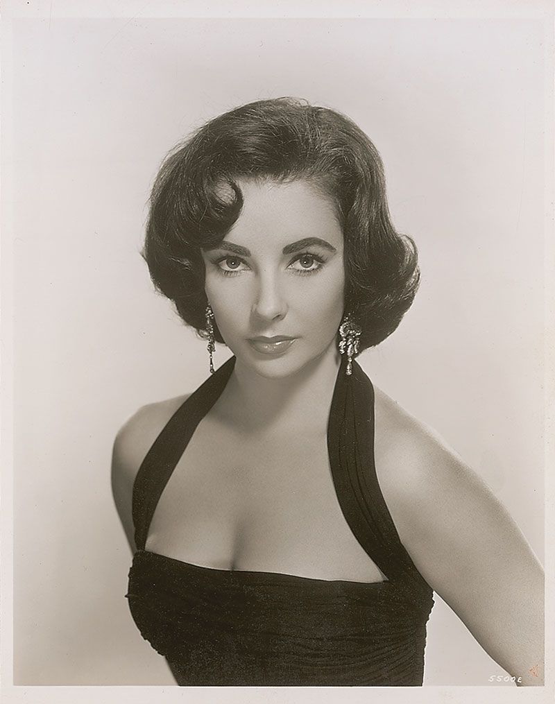 Stunning original glossy 8 x 10 double-weight MGM publicity photo of Taylor in a lovely black dress and diamond earrings, stamped on the reverse, “Elizabeth Taylor, Metro-Goldwyn-Mayer.” In fine condition.