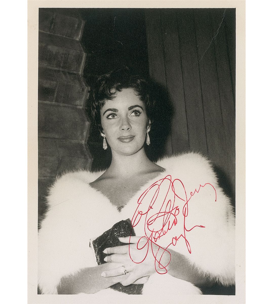 Gorgeous vintage matte-finish 5 x 7 photo of Taylor wrapped in white fur, signed and inscribed in fountain pen, “To Jerry, Elizabeth Taylor.” In fine condition, with a noticeable crease to the upper right.