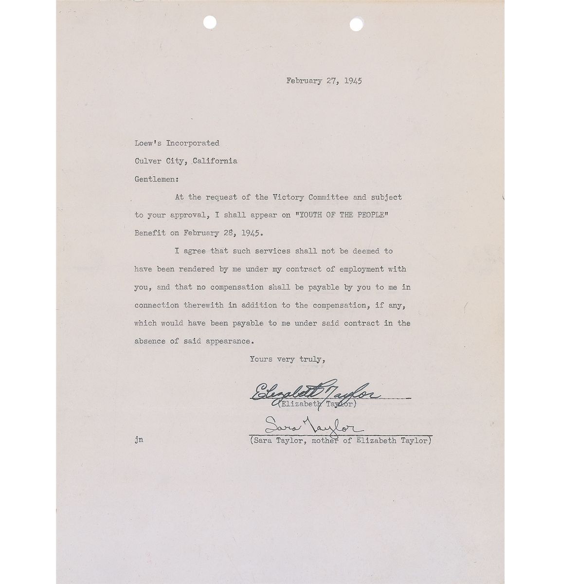DS, one page, 8.5 x 11, February 27, 1945. An agreement between Taylor and Loew’s Incorporated, signed on her 13th birthday. In part: “At the request of the Victory Committee and subject to your approval, I shall appear on ‘Youth of the People’ Benefit on February 28, 1945.” Signed at the conclusion by Elizabeth Taylor and countersigned by her mother, Sara Taylor. In fine condition. The Hollywood Victory Committee was an organization founded during World War II so that entertainers could contribute to the war effort through bond drives and improving morale for troops.
