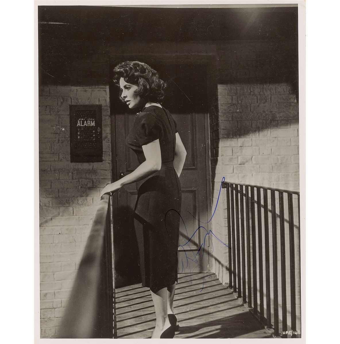 Exceptional glossy 8 x 10 photo of Taylor in the classic 1959 film Suddenly, Last Summer, signed in blue ink. In fine condition, with subtle spotting to finish. Based on the Tennessee Williams play by the same name, the film featured an exceptional cast—Katharine Hepburn and Montgomery Clift also co-starred, and both Taylor and Hepburn received nominations for the Academy Award for Best Actress. Neither of them won the Oscar, but Taylor did receive a Golden Globe for her memorable performance.