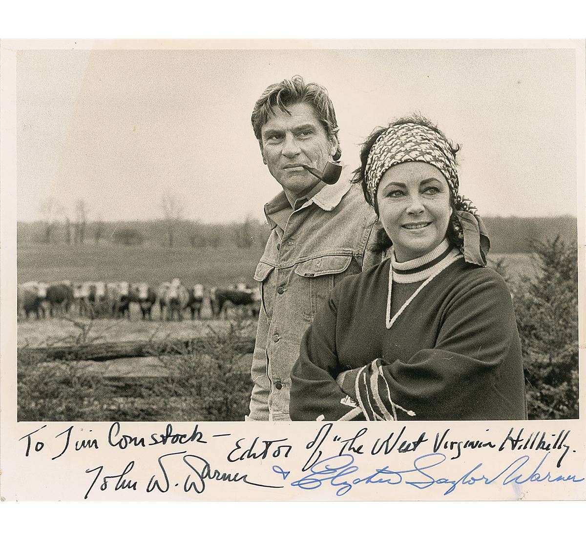 Semi-glossy 10 x 8 photo of Taylor with her seventh husband, John Warner, signed in the lower border in blue ink, “Elizabeth Taylor Warner” and signed and inscribed in black ink, “To Jim Comstock—Editor of The West Virginia Hillbilly, John W. Warner.” Reverse bears the photographer’s stamp of Washington Star’s Bernie Boston. In very good condition, with mild toning, scattered surface creases and impressions, a tape remnant to the right edge, and a slight brush to Taylor’s signature.