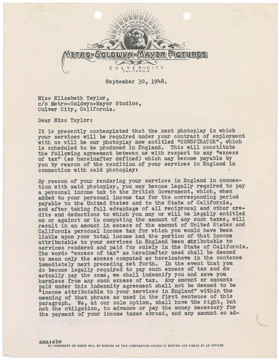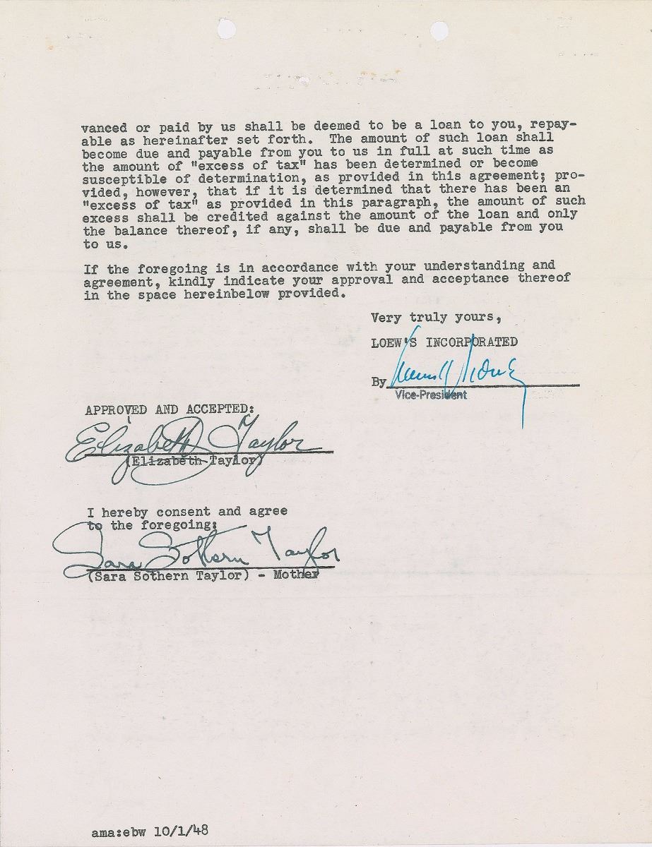 DS, two pages, 8.5 x 11, September 30, 1948. Agreement between Taylor and Metro-Goldwyn-Mayer in regards to “any ‘excess of tax’…which may become payable by you by reason of the rendition of your services in England in connection with…our photoplay now entitled ‘Conspirator.’” Signed at the conclusion in black ink by the sixteen-year-old Taylor and her mother Sara Sothern Taylor, and countersigned by a studio representative. In fine condition.