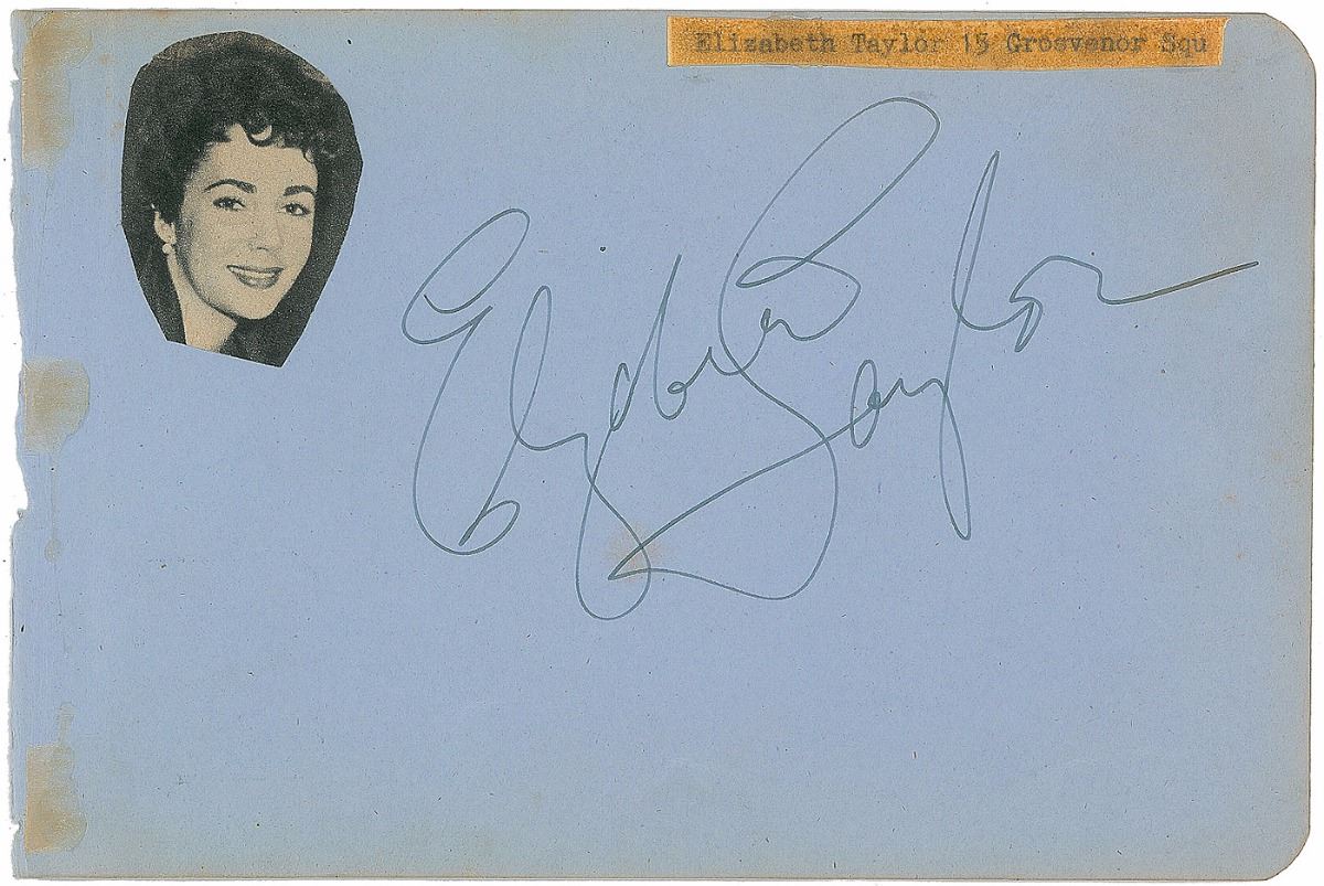 Vintage fountain pen signature, “Elizabeth Taylor,” on a blue 6.5 x 4.5 album page bearing an affixed label and image. In fine condition.