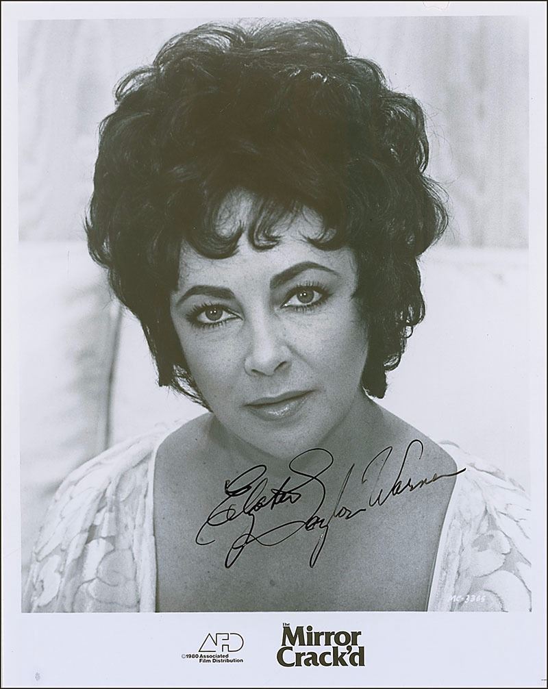 Glossy 8 x 10 AFD publicity photo of Taylor as Marina Rudd from the 1980 film The Mirror Crack’d, signed in black felt tip, “Elizabeth Taylor Warner.” Reverse bears an affixed AFD press caption. In fine condition, with a chip to top edge.