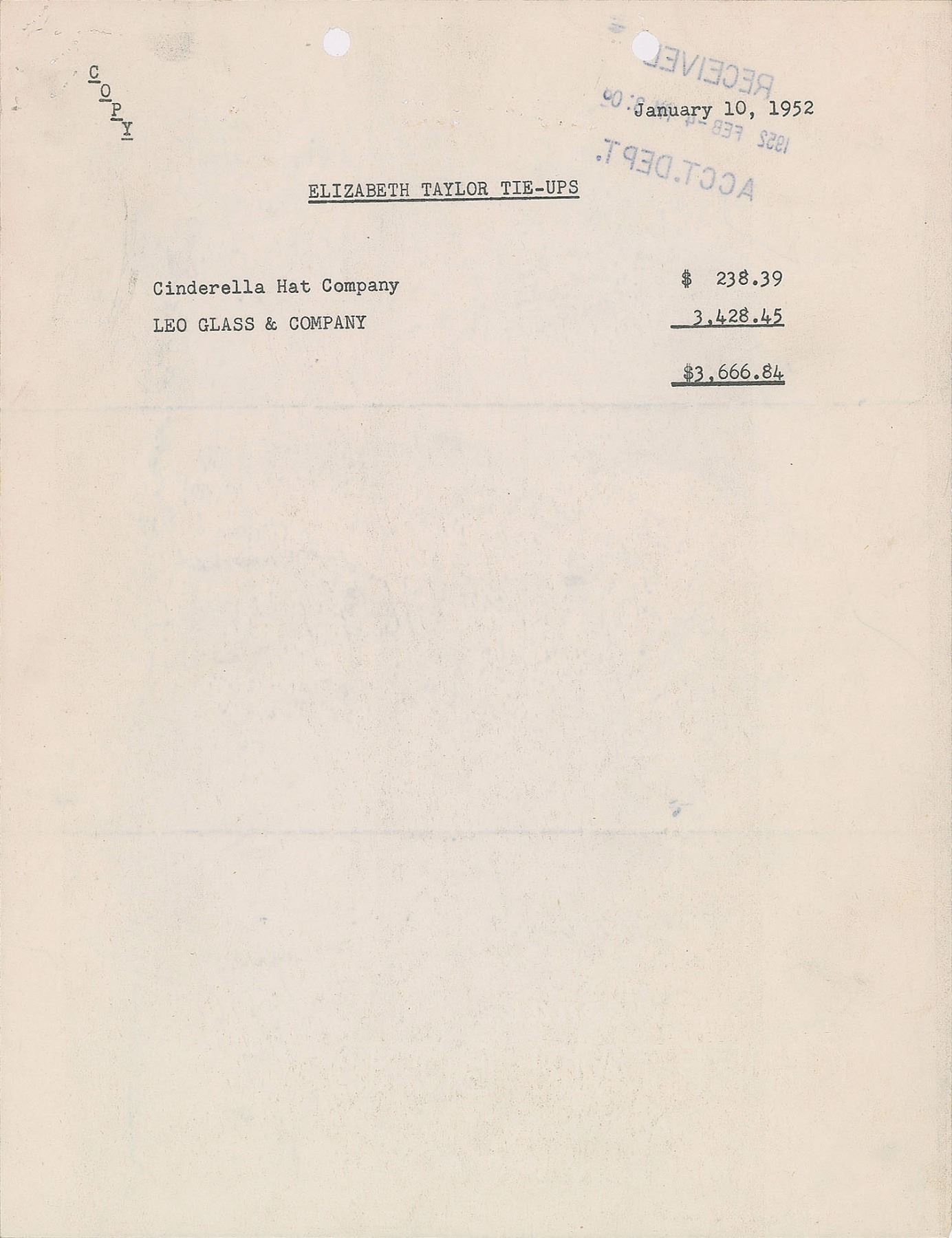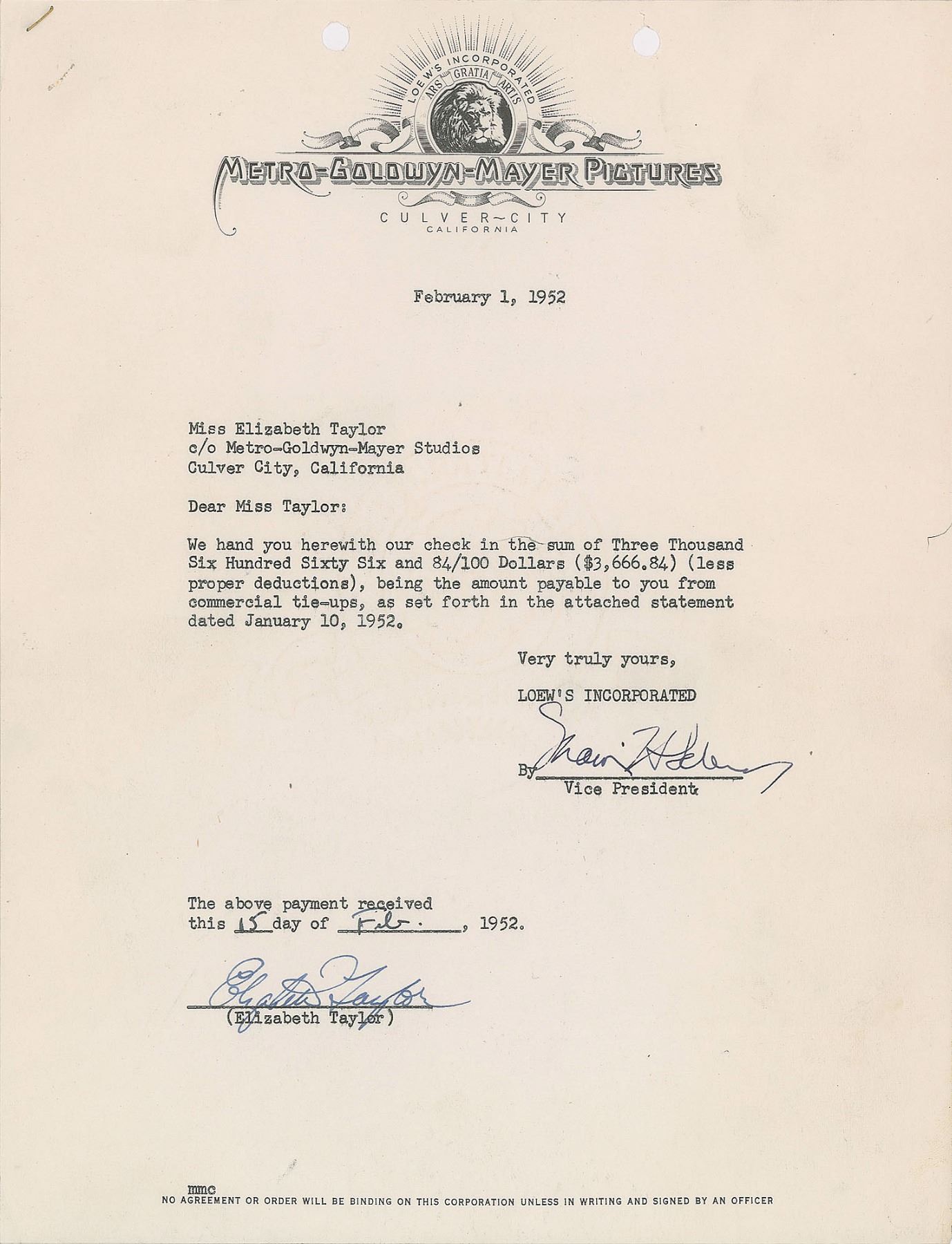 DS, two pages, 8.5 x 11, February 15, 1952. MGM document pertaining to a payment, in full: "We hand you herewith our check in the sum of Three Thousand Six Hundred Sixty Six and 84/100 Dollars ($3,666.84) (less proper deductions), being the amount payable to you from commercial tie-ups, as set forth in the attached statement dated January 10, 1952." Signed at the conclusion in fountain pen by Taylor to confirm receipt. The accompanying statement lists payments from the Cinderella Hat Company and Leo Glass & Company. In fine condition.