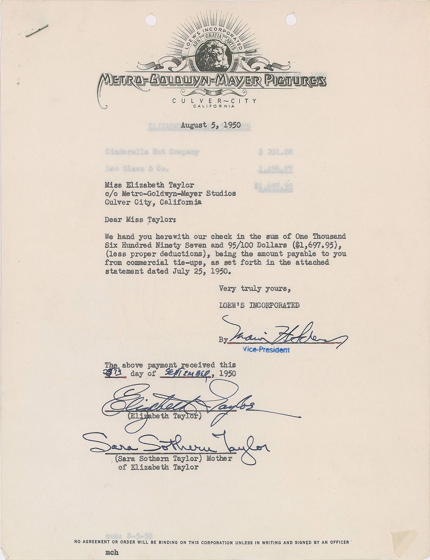 DS, two pages, 8.5 x 11, Metro-Goldwyn-Mayer Pictures, Culver City, California letterhead, September 25, 1950. Official letter from Loew's Incorporated, in full: “We hand you herewith our check in the sum of One Thousand Six Hundred Ninety Seven and 95/100 Dollars ($1,697.95), (less proper deductions), being the amount payable to you from commercial tie-ups, as set forth in the attached statement dated July 25, 1950.” The document is boldly signed “Elizabeth Taylor” and is also signed by “Sara Sothern Taylor,” Elizabeth Taylor’s mother. The schedule noted in the document is attached and lists “Elizabeth Taylor Tie-Ups” as Cinderella Hat Company and Leo Glass & Co. In fine condition, with a small clear corner mount affixed to the lower right corner area.