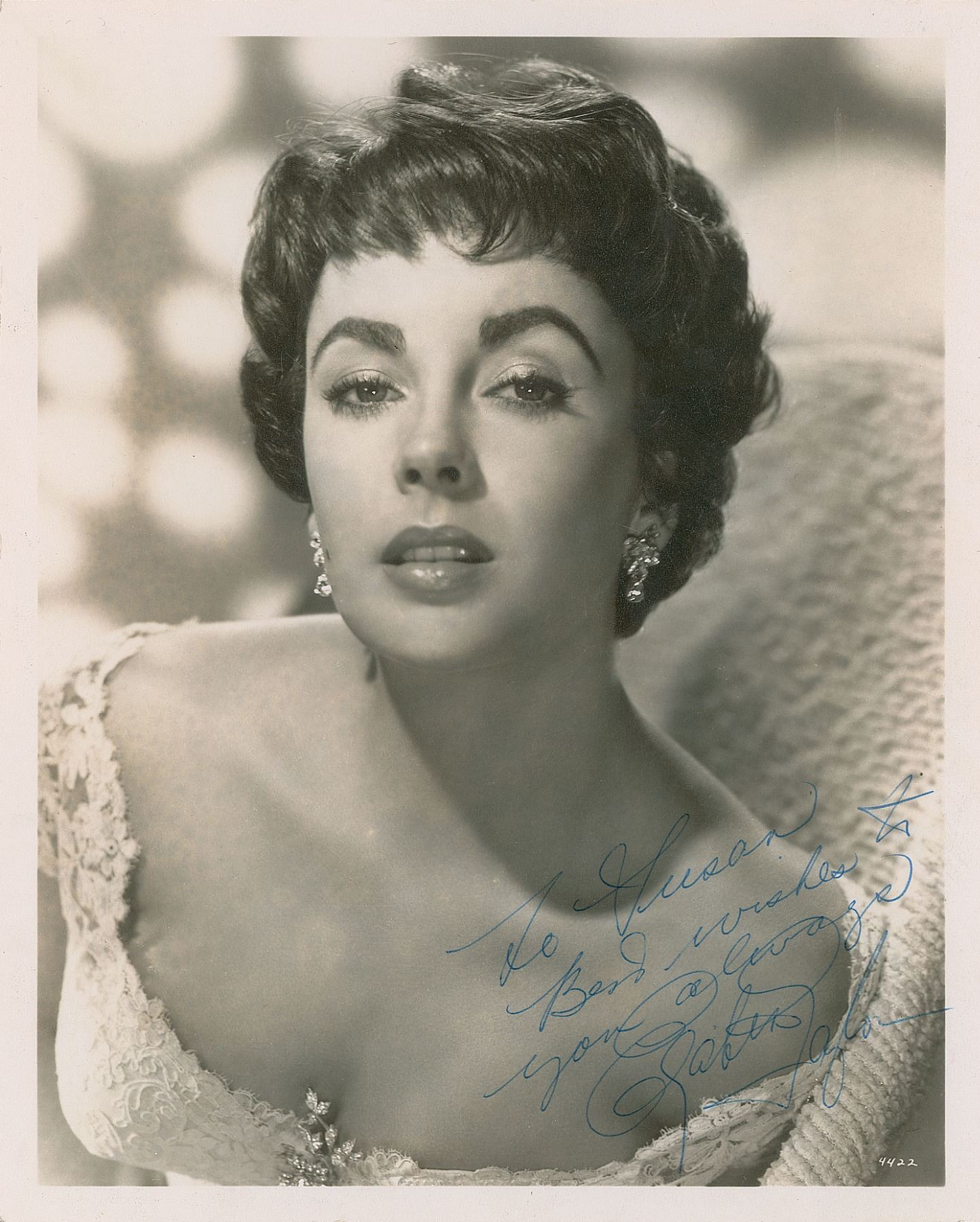Spectacular vintage matte-finish 8 x 10 MGM publicity photo of Taylor in a low-slung lacy top, neatly signed and inscribed in blue ballpoint, "To Susan, Best wishes to you always, Elizabeth Taylor.” Reverse bears an "Elizabeth Taylor / Metro-Goldwyn-Mayer" ink stamp. In fine condition, with some light silvering to her hair.
