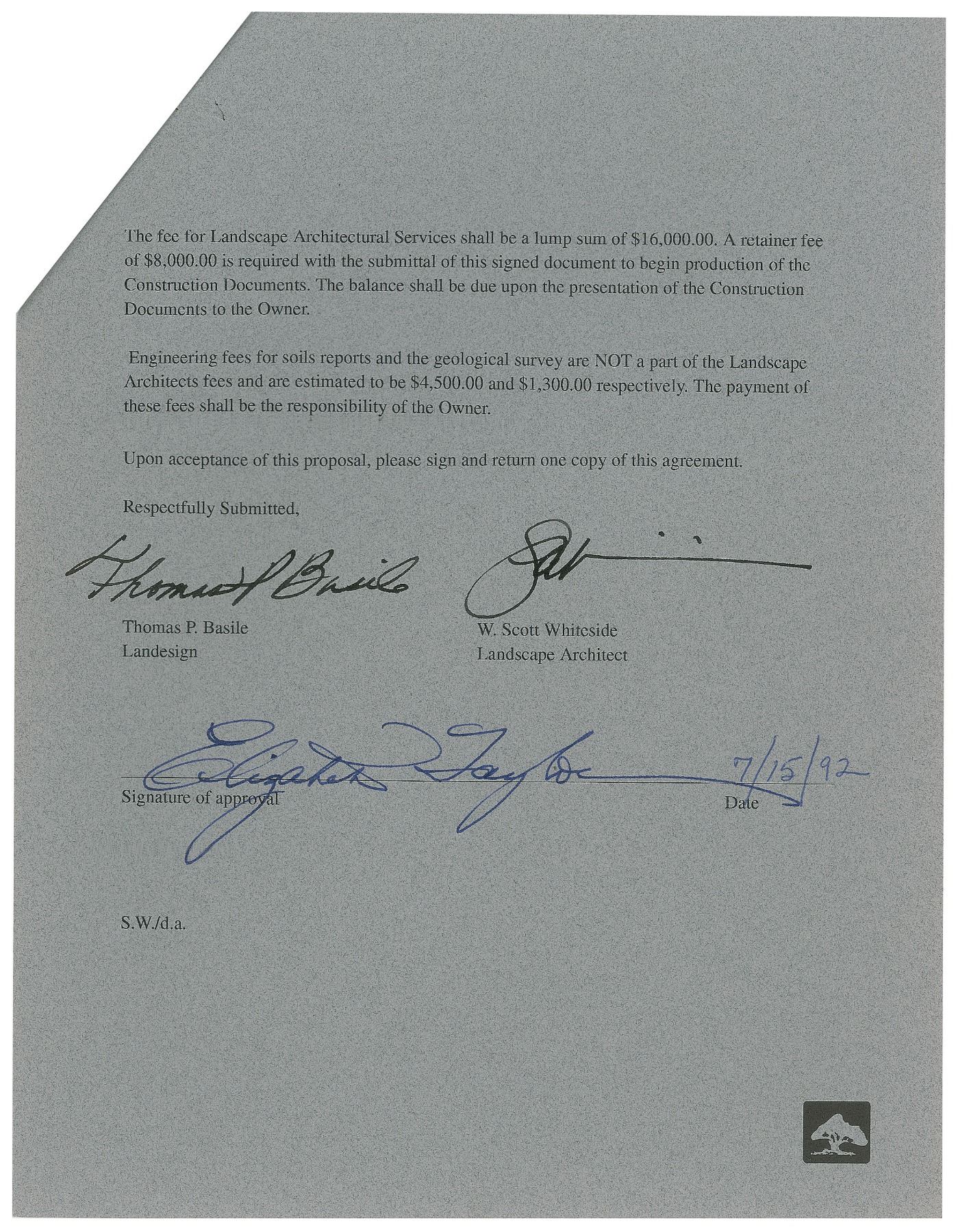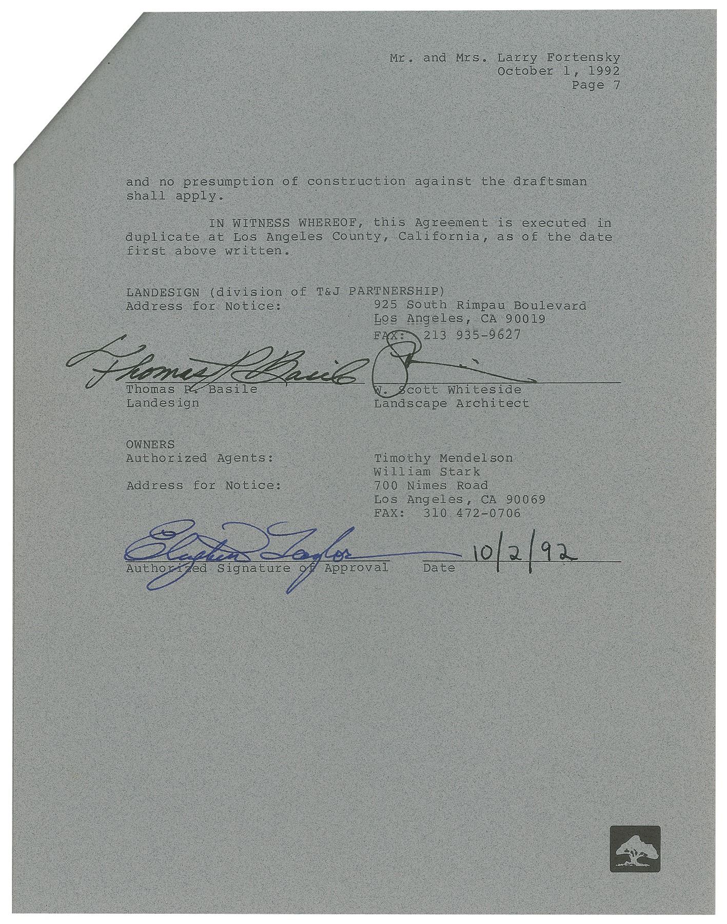 Group of three DSs, 23 total pages, 8.5 x11, dated between June and October 1992. Agreement contracts and proposals between Landesign and Taylor and her seventh and last husband, Larry Fortensky, in relation to the various construction and demolition projects around the couple's famous Los Angeles mansion at 700 Nimes Road, with operations including: structural deck and retaining wall, soil compaction, pool and spa (including ponds and waterfalls), greenhouse, plumbing, lighting/electrical, ironwork, concrete, masonry work, and barbecue, and landscaping. The contracts consist of two stapled packets, which includes two receipts. Signed at the conclusion of each in blue ink by Elizabeth Taylor. In overall fine condition.