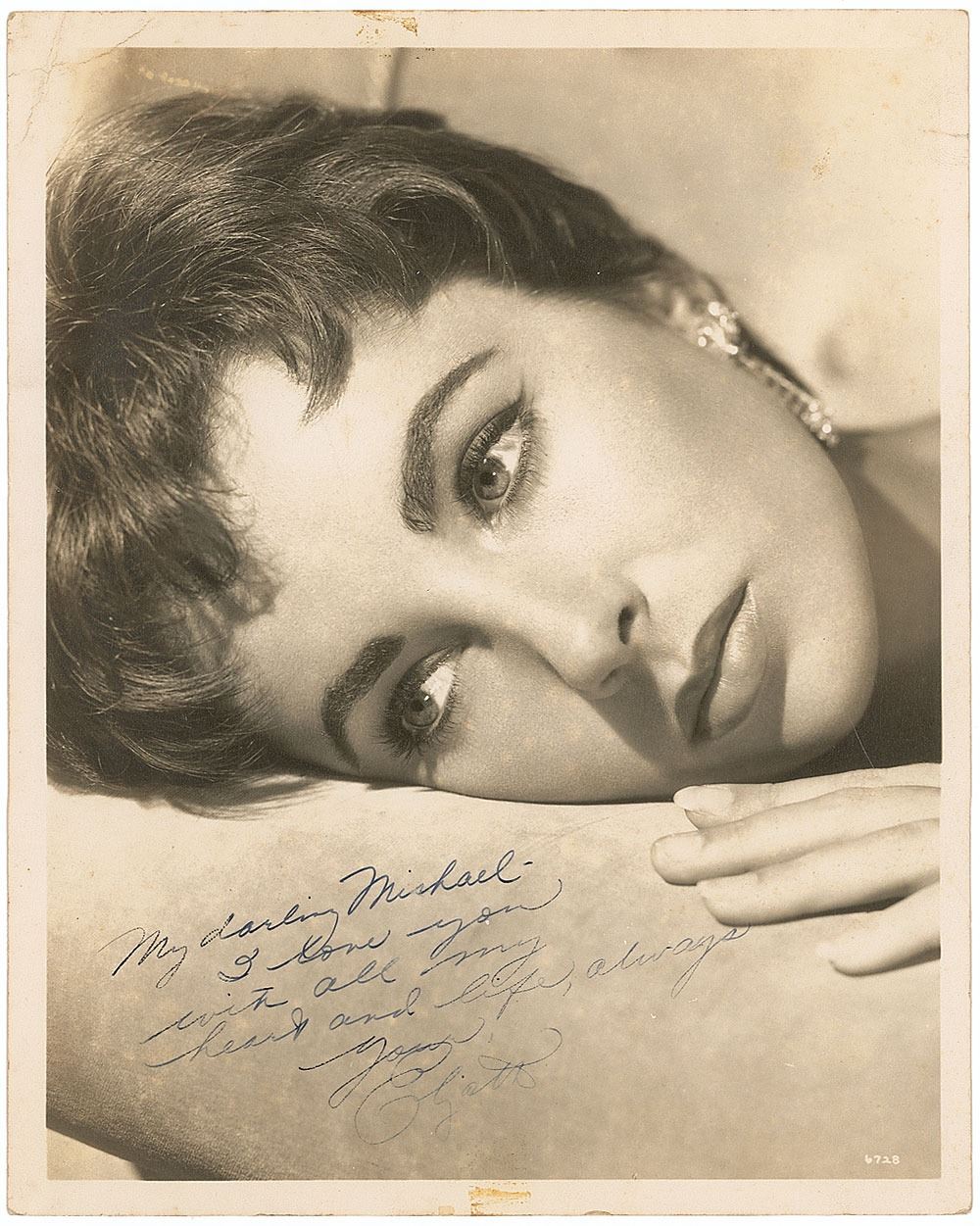 Stunning vintage matte-finish 8 x 10 close-up photo of Elizabeth Taylor lying on a pillow, signed and inscribed in fountain pen, "My darling Michael, I love you with all my heart and life, always, Your, Elizabeth." In very good condition, with some creasing and adhesive remnants to the borders, scattered mottled discoloration causing light spotting to the facial area, and the signature a shade light due to decreased ink flow. According to the consigner, this photo was inscribed to her second husband, actor Michael Wilding. Taylor was Wilding's second wife as well, he being married four times to her seven. A lovely portrait with a passionate inscription from one lover to another.