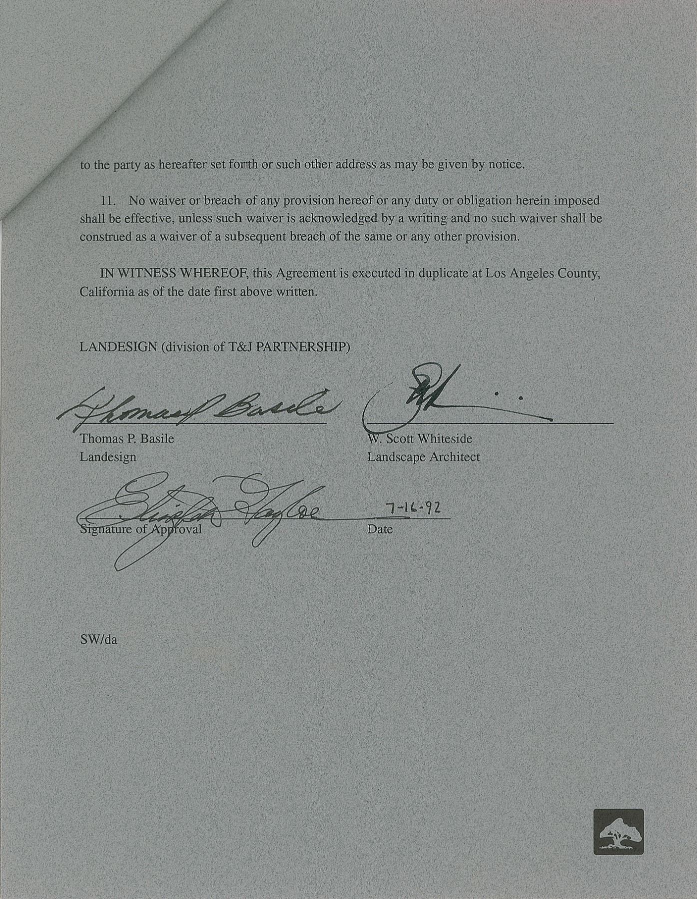 Lot of two DSs, seven total pages, 8.5 x11, dated July 10 and 15, 1992. Agreement contracts and proposals between Landesign and Taylor and her seventh and last husband, Larry Fortensky, in relation to the various construction and demolition projects around the couple's famous Los Angeles mansion at 700 Nimes Road. The contracts are stapled together with four check receipts to front. Signed at the conclusion of both in black ink by Elizabeth Taylor. In overall fine condition.