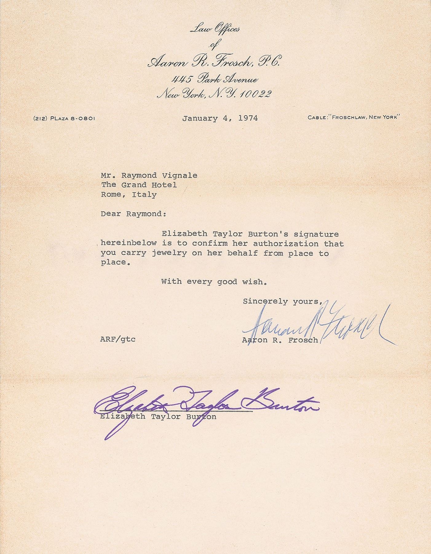DS, signed “Elizabeth Taylor Burton,” one page, 8.5 x 11, January 4, 1974. Document issued to Raymond Vignale of the Grant Hotel in Rome, Italy, by the Law Offices of Aaron R. Frosch, in full: "Elizabeth Taylor Burton's signature hereinbelow is to confirm her authorization that you carry jewelry on her behalf from place to place." Boldly signed at the conclusion in purple felt tip by Taylor. In fine condition. Taylor famously collected jewelry through her life, and owned the 33.19-carat Krupp Diamond, the 69.42-carat Taylor-Burton Diamond, and the 50-carat La Peregrina Pearl, formerly owned by Mary I of England—all three were gifts from husband Richard Burton.