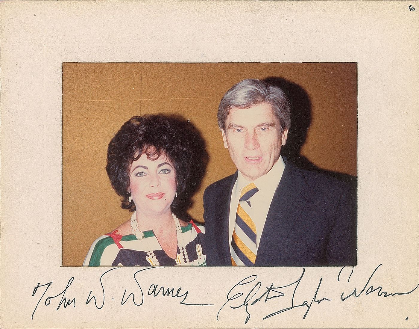 Color satin-finish 6.5 x 4.5 photo of Elizabeth Taylor and her sixth husband, Senator John Warner, at a Republican fundraiser in Arizona in 1980, presented in a 9.25 x 7.25 mat, signed on the mat in black ink, "Elizabeth Taylor Warner" and "John W. Warner." In fine condition.