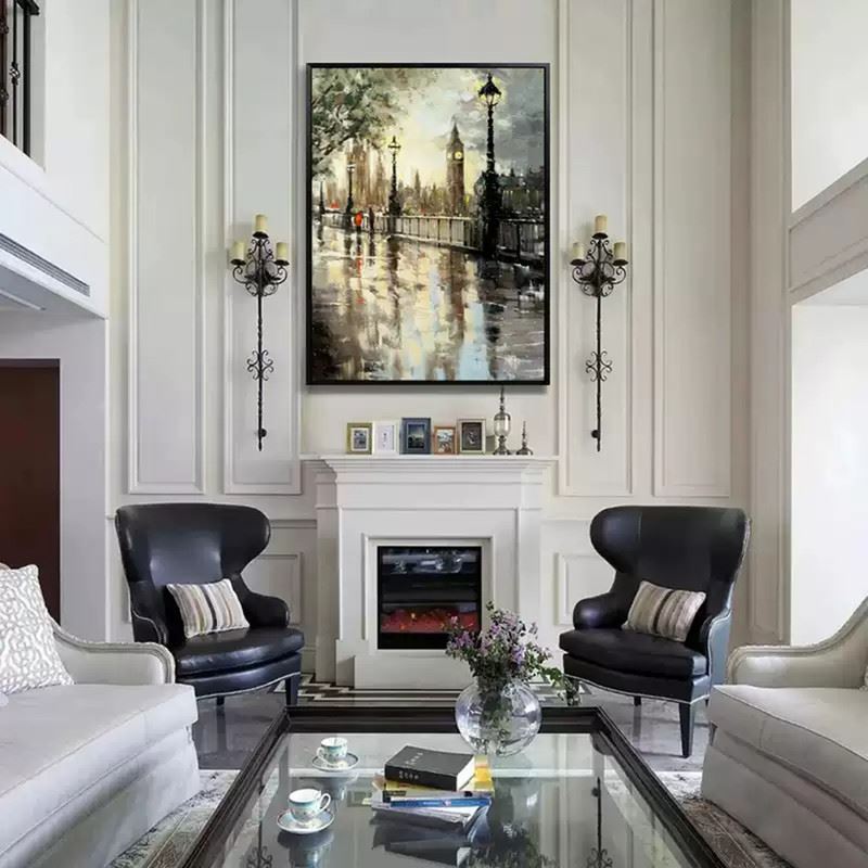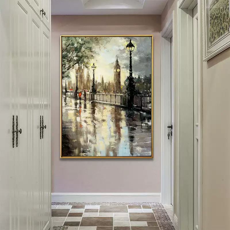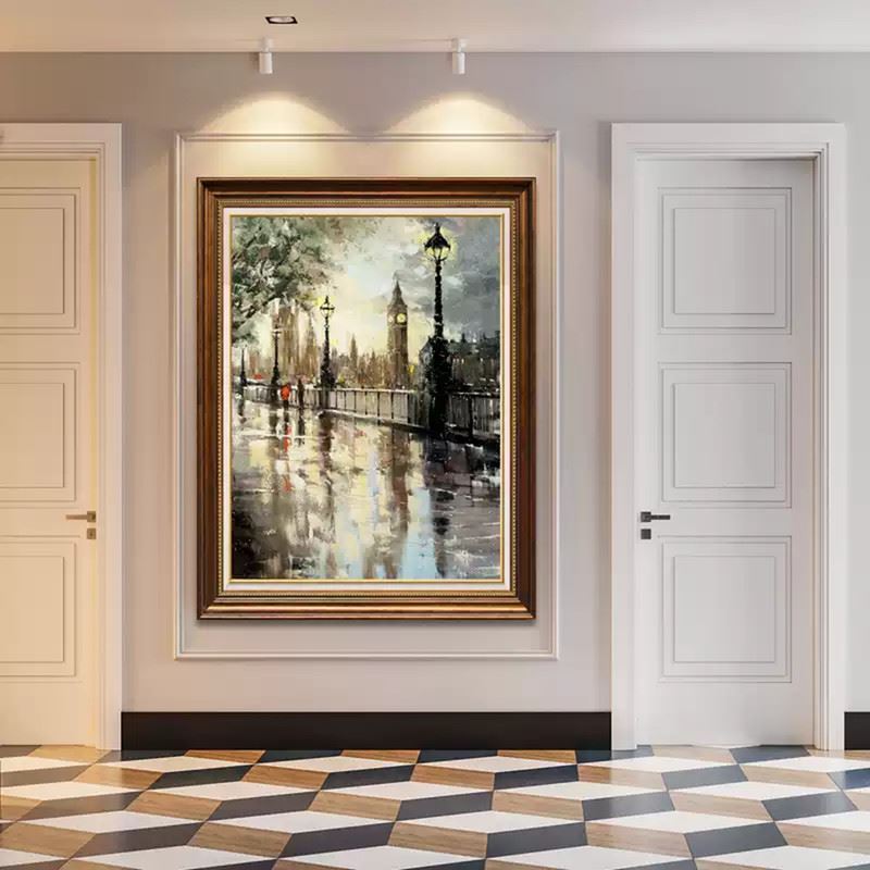 After the rain in London, Elizabeth Tower rises through mist and lamplight, its reflection stretching across the shining wet street. Dimensions: 28 x 35 inches.