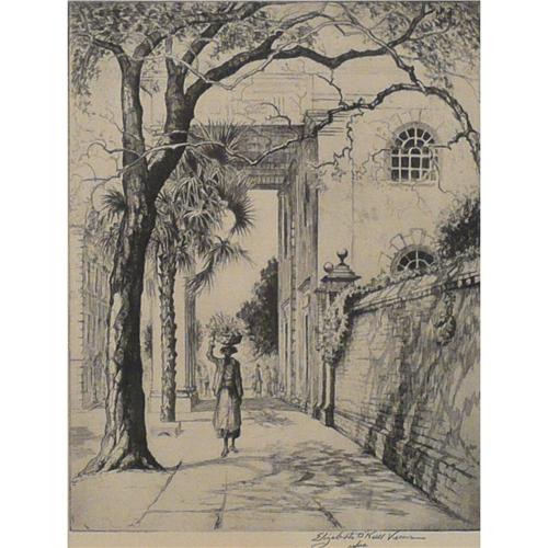 Elizabeth, Print of an Etching, 9" x 7" Woman with Basket.