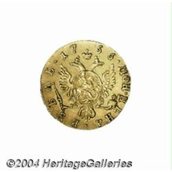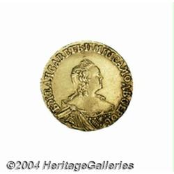 Elizabeth gold Rouble 1756, C-22, choice VF-XF, well-struck and very attractive.From the Morris Geiger Collection. Important notice: Heritage usually auctions material at the rate of 200-250 lots per hour. On some occasions eBay Live bid software or the Internet may not be able to keep up with the pace of the auction. We recommend placing a realistic absentee bid now as insurance to avoid disappointment. Occasionally the auctioneer may eliminate or reject an eBay Live bid, and the auctioneer may also reopen a lot after the close of the eBay live bidding (usually because we missed an audience bid), and may reject your bid even if it shows you as the winning bidder. By bidding via eBay Live, you agree that Heritage may award the lot to another bidder at its sole discretion under the circumstances described above or any other reasonable circumstances. Also please note that all Heritage lots purchased through eBay Live carry a 20% Buyer's Premium. Please make sure you read the Terms and Conditions before you bid.