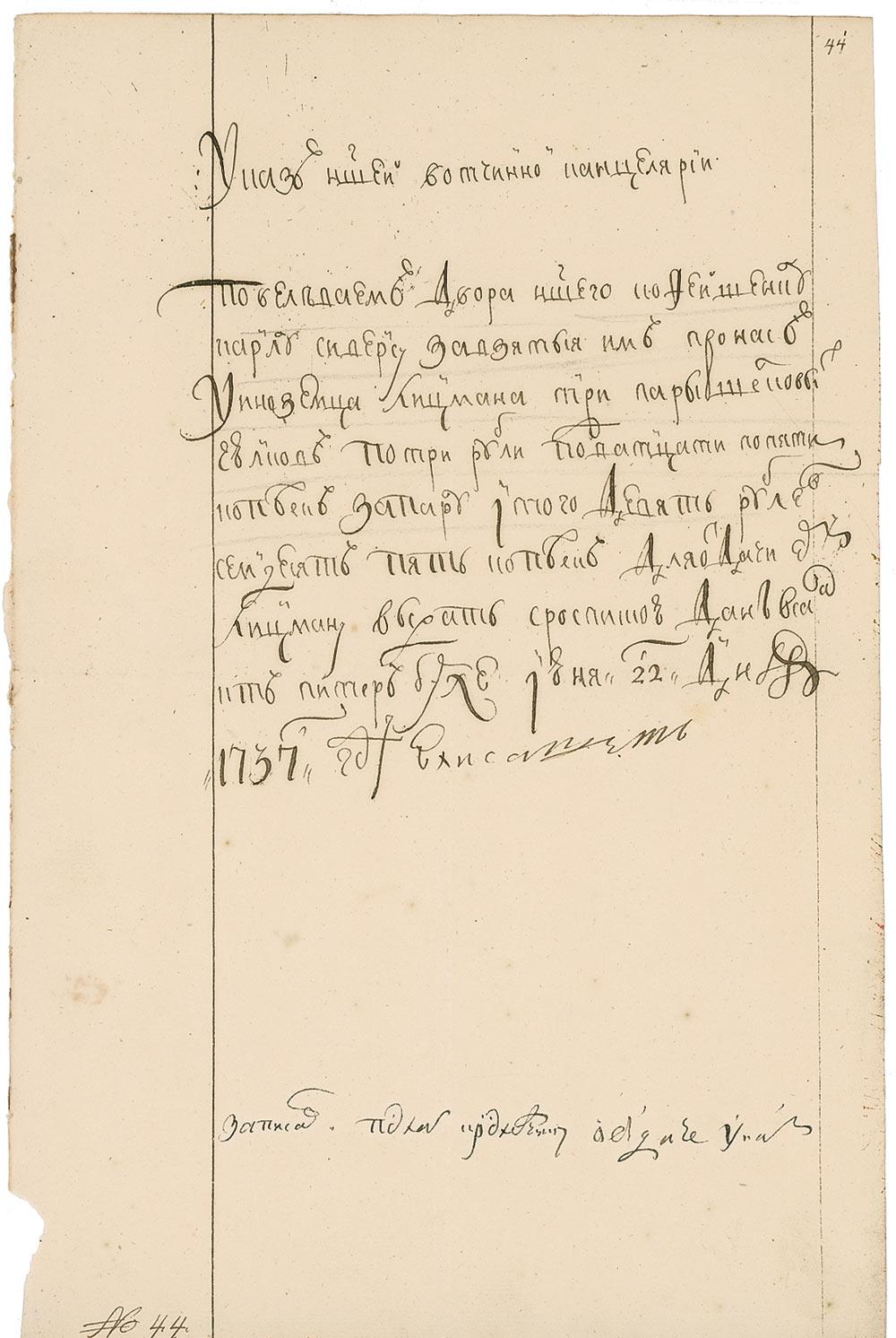 Daughter of Peter the Great, she overthrew her despised cousin Anna and was proclaimed Czarina of Russia in 1741. Manuscript DS, in Cyrillic, one page, 8.25 x 12.5, 1737. Boldly penned untranslated document. Vertical fold affecting one letter of signature, scattered light toning and soiling, and light pencil underlining to text, otherwise fine condition. Pre-certified PSA/DNA and RRAuction COA.