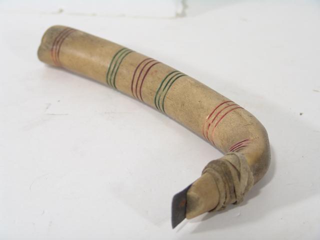 19th Century, Early Cheyenne scraper with original iron blade and hide lashing, with many tally marks and overall incising, ochred red and green. 11-1/2" x 5"