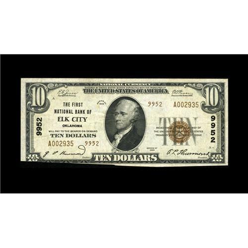 <B>Elk City, OK</B></I> - $10 1929 Ty. 2 <B>The First NB</B></I> Ch. # 9952<BR>A tougher small size note from the only collectible bank in town. <B>Very Fine</B></I> or a bit better, but trimmed in a bit at the bottom left.<BR><BR><b>Shipping:</b> Coin/Currency (<a target="_blank" href="http://www.heritageauctions.com/common/shipping.php">view shipping information</a>)