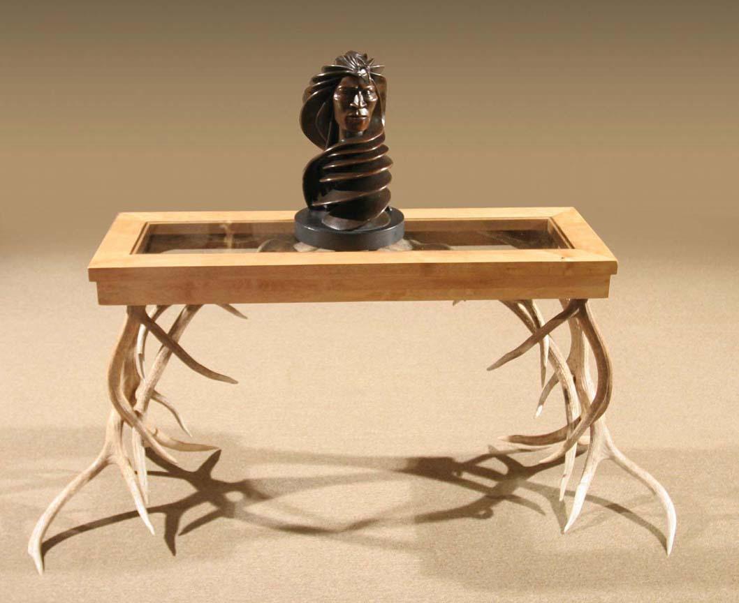 Elk Horn Accent Table. Maple with glass top. 30" tall x 51" long x 17" deep. (est $2,000-3,000). For condition reports please visit: www.auctioninsantafe.com/cr2011.pdf